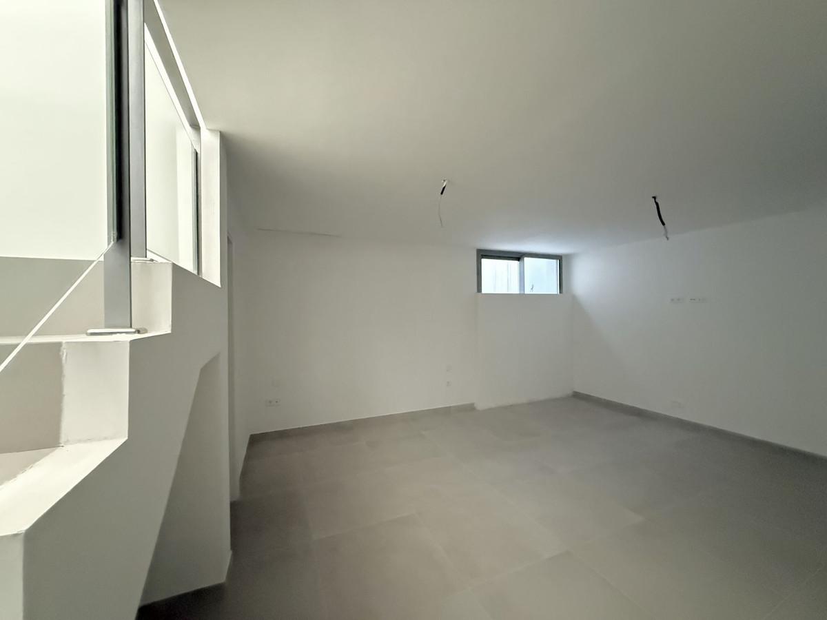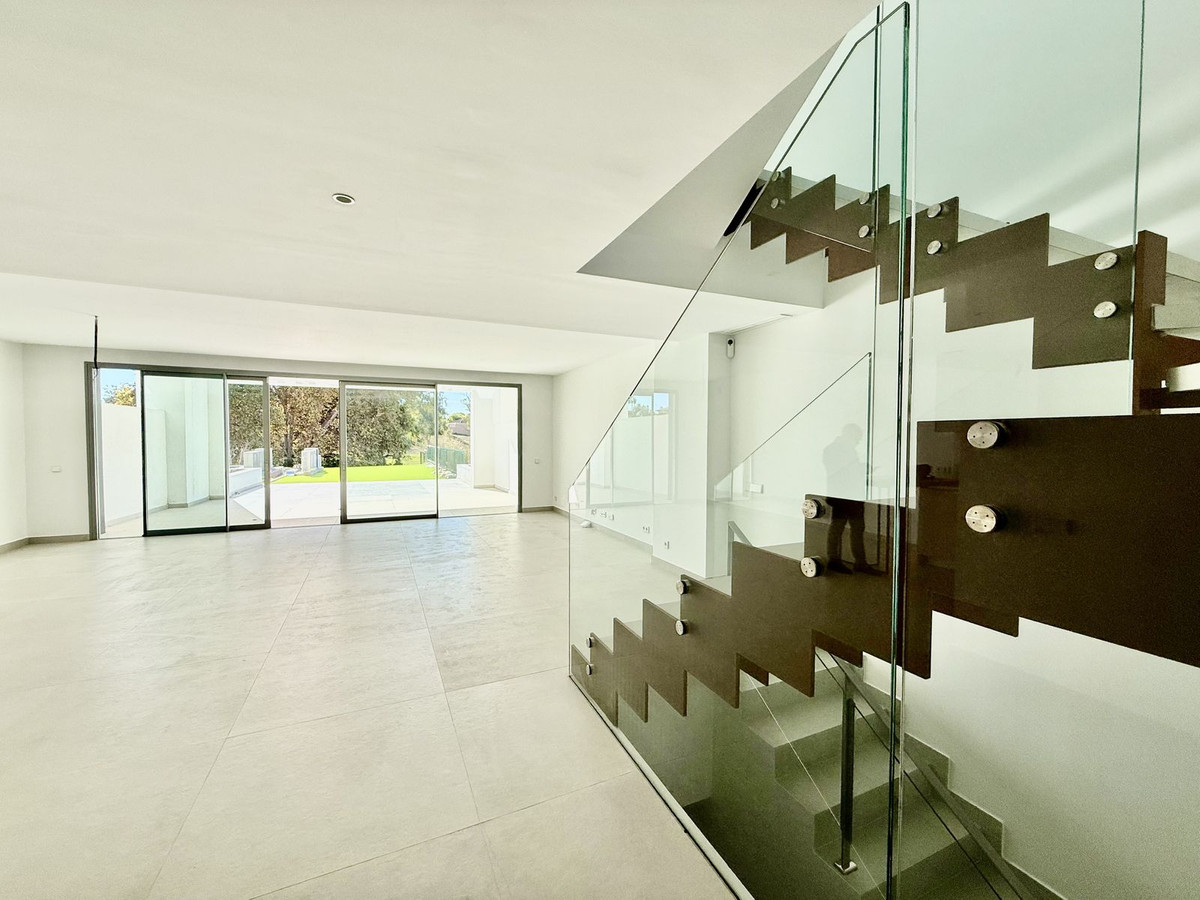 The house stands out for its contemporary design, spacious layout, and abundant natural light. The entrance hall leads to a living room with ceilings over 3 meters high, seamlessly connecting to the dining area and a designer open-plan kitchen equipped with high-end NEFF appliances. Adjacent to the kitchen is a small terrace, while the living room opens to a large terrace and private south-facing garden. A guest toilet completes this floor.