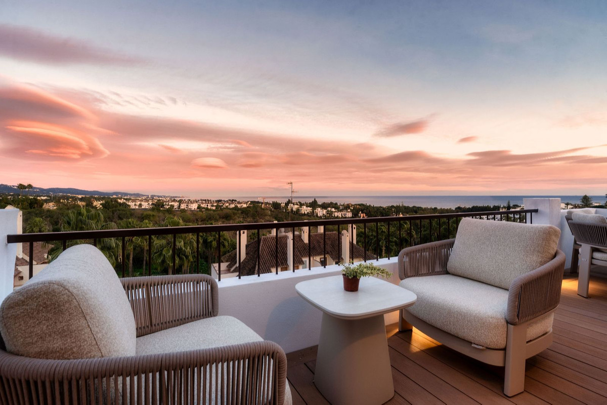 Set within the prestigious Golden Mile, this exquisite fully renovated duplex penthouse in the sought-after Coto Real is a rare blend of elegance, comfort, and breathtaking scenery. South-facing and bathed in natural light throughout the day, the property enjoys panoramic sea and mountain views that unfold from sunrise. The interiors have been carefully redesigned using high-standard materials and finished in warm, subtle tones, creating a refined yet inviting atmosphere that feels both luxurious and timeless. The penthouse offers three beautifully appointed bedrooms, the master has a walk-in closet and a private west facing terrace, two stylish bathrooms, and an additional guest toilet, perfectly laid out over two levels to ensure privacy and functionality. Every space flows effortlessly, enhancing the sense of openness while framing the stunning Mediterranean and surrounding mountain landscape. A truly exceptional home for those seeking a turn-key luxury residence in one of Marbella’s prime locations—where sophisticated design meets unforgettable views.