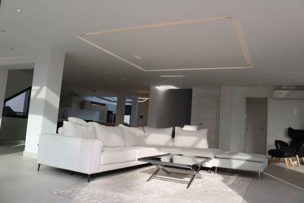 A superb modern villa with close proximity to amenities, award-winning golf courses, and gorgeous beaches is located in an exclusive gated community in the hills of Nueva Andalucía. It offers breathtaking views of the golf valley, the Mediterranean Sea, and Gibraltar.