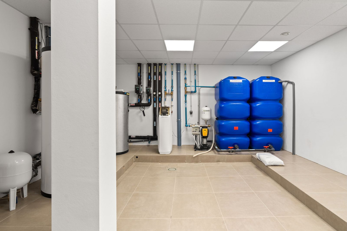 The lower level is designed for both comfort and leisure, offering a private gym and spa area with sauna, jacuzzi, and hammam, along with entertainment spaces, staff accommodation, storage, and utility rooms. The villa is equipped with underfloor heating, advanced climate control, double glazing, and a fireplace. Energy efficiency is enhanced through photovoltaic solar panels with FVE battery system and solar water heating.
