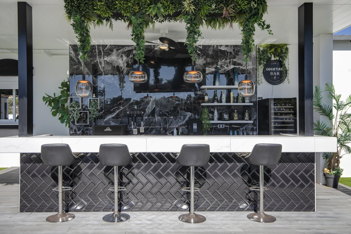 The outdoor areas are truly special. The mature Zen-inspired garden creates a tranquil and private sanctuary, complete with an outdoor bar, BBQ area, and multiple chill-out zones designed for entertaining and relaxation. A games room adds further versatility for family enjoyment.