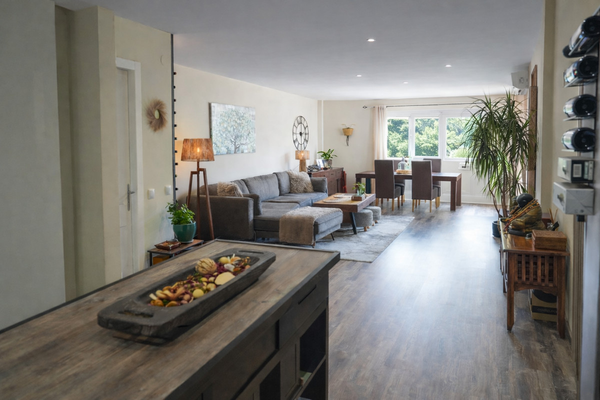 L'intérieur de l'appartement est agencé avec soin et comprend un salon spacieux et une salle à manger séparée, tous deux meublés avec goût. La cuisine entièrement équipée ravira les passionnés de cuisine, tandis que la climatisation et le chauffage central garantissent un confort optimal en toute saison. Des placards intégrés offrent un espace de rangement généreux, et l'agencement général allie fonctionnalité et élégance.