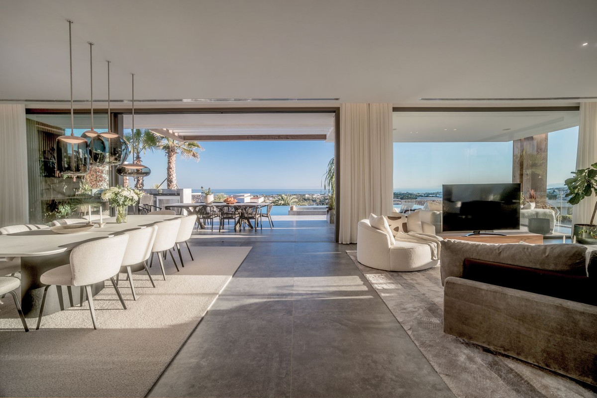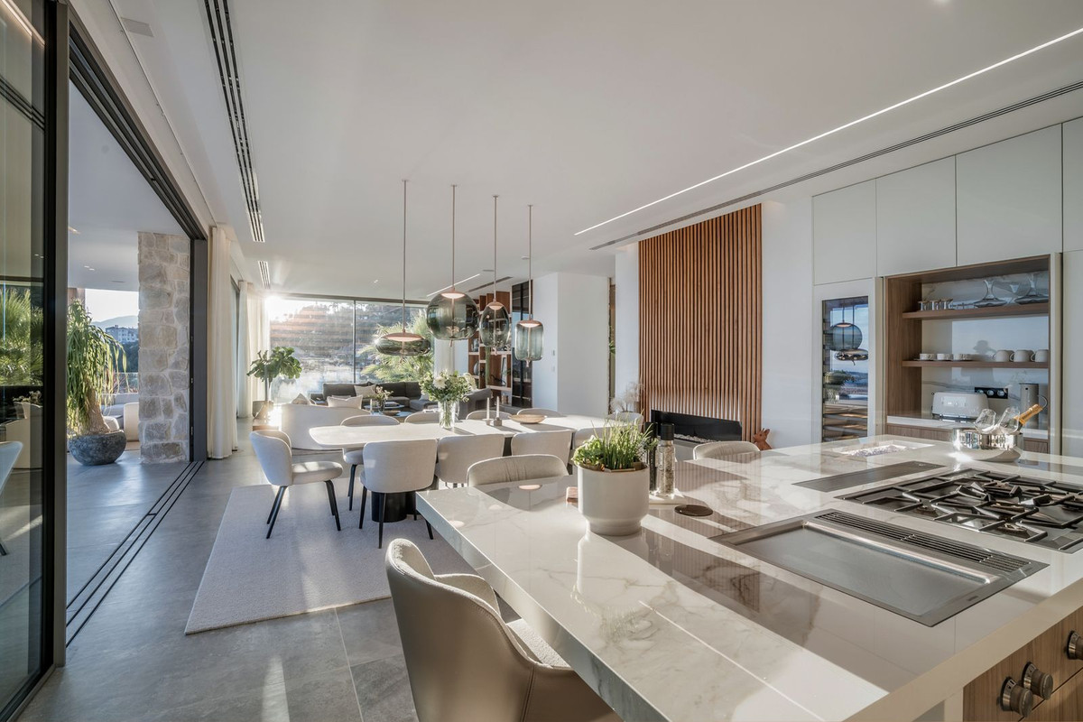 Offrant une vue panoramique s'étendant de la mer Méditerranée aux côtes africaines, cette demeure au design contemporain sublime cette expérience. Ses intérieurs décloisonnés se fondent harmonieusement dans le paysage naturel. De vastes baies vitrées et des espaces de vie généreux créent une transition fluide entre l'intérieur et l'extérieur, baignant les lieux de lumière naturelle, d'air pur et offrant des vues imprenables à 360°.