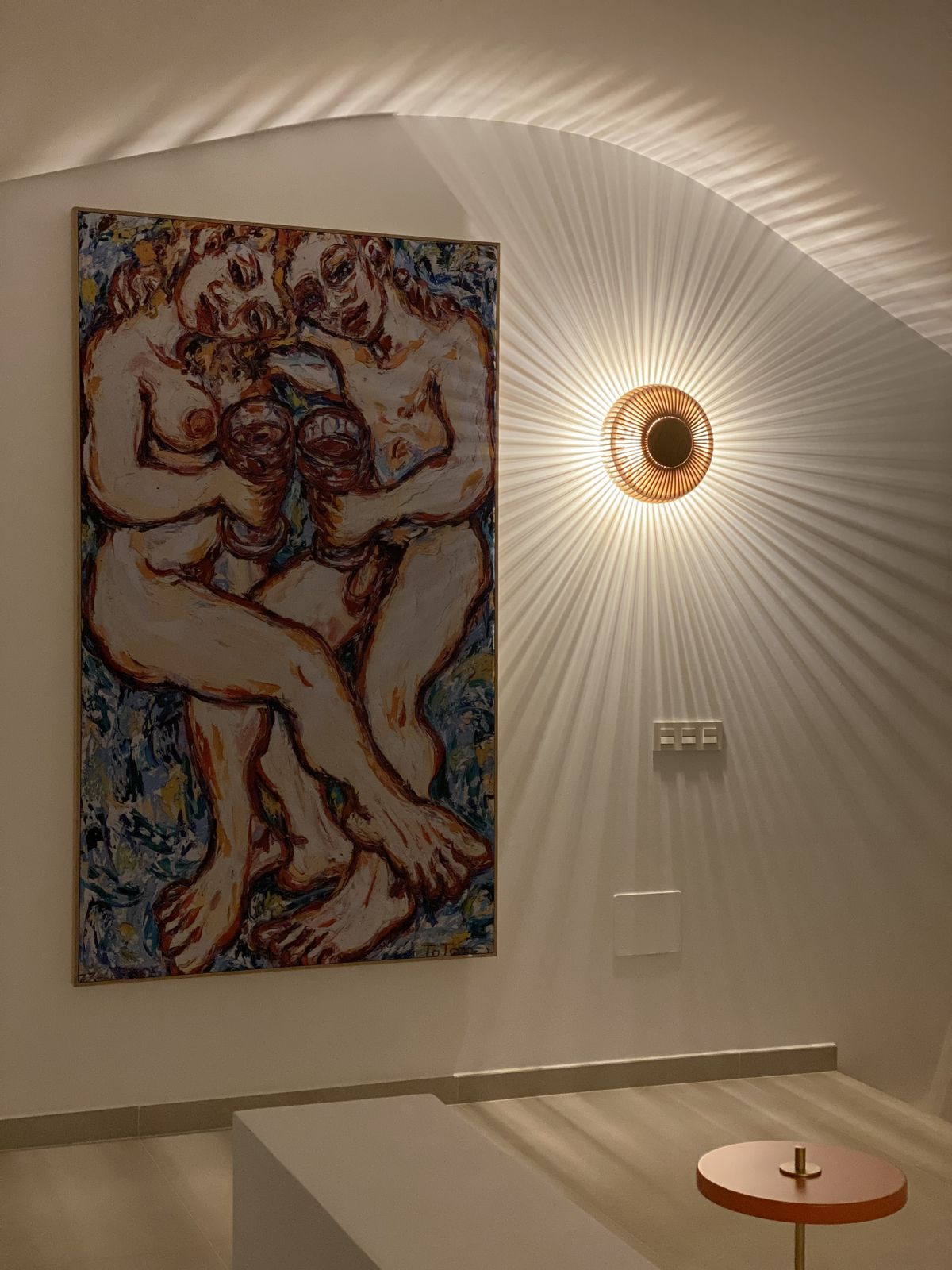 Un spectaculaire escalier moderne en métal, bois et verre mène à l'étage supérieur, dédié à l'impressionnante suite parentale. On y trouve une chambre spacieuse avec accès direct à une seconde terrasse privée offrant une vue panoramique imprenable sur la mer. L'étage comprend également un dressing, une luxueuse salle de bains attenante et un espace buanderie pratique.