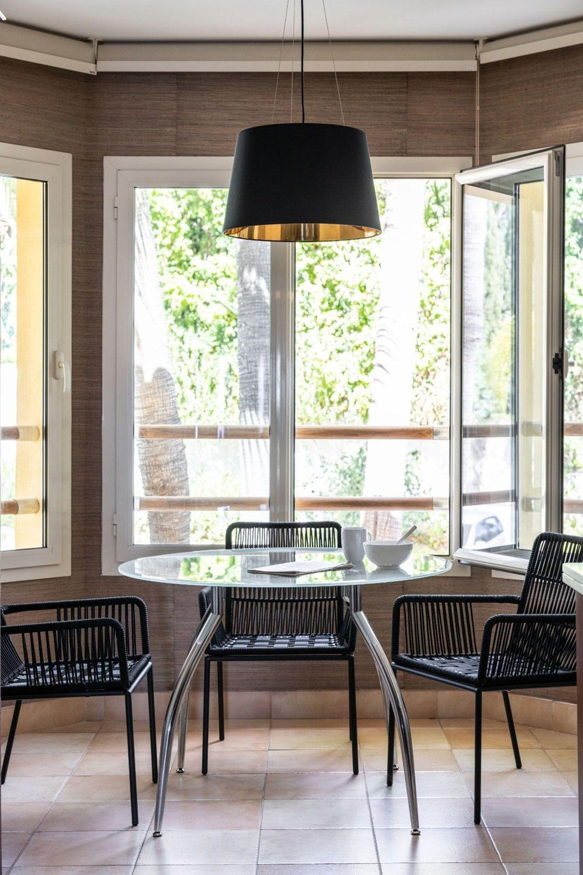 Appréciez l'élégance des murs en travertin de la terrasse et une cuisine entièrement équipée avec un coin repas convivial. Le salon et la salle à manger s'ouvrent harmonieusement sur une terrasse couverte, idéale pour recevoir ou se détendre en profitant d'une vue imprenable.