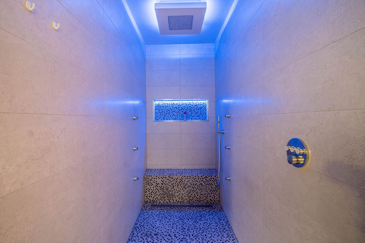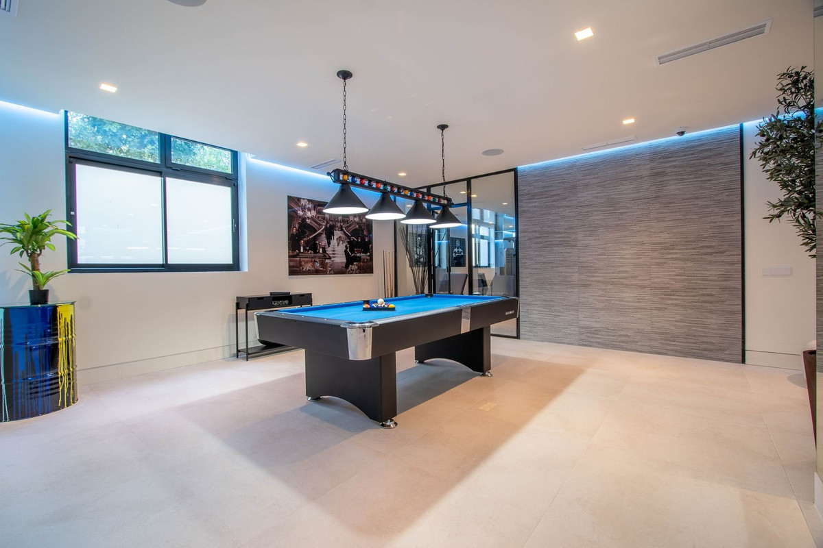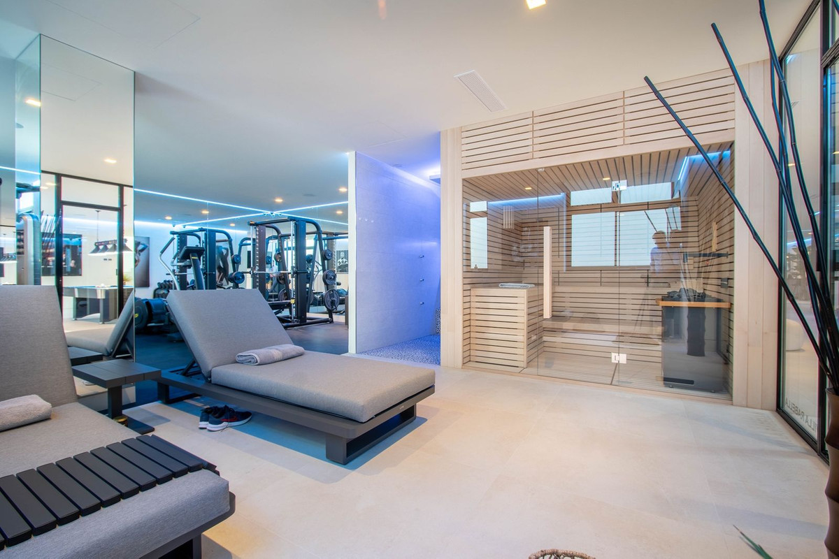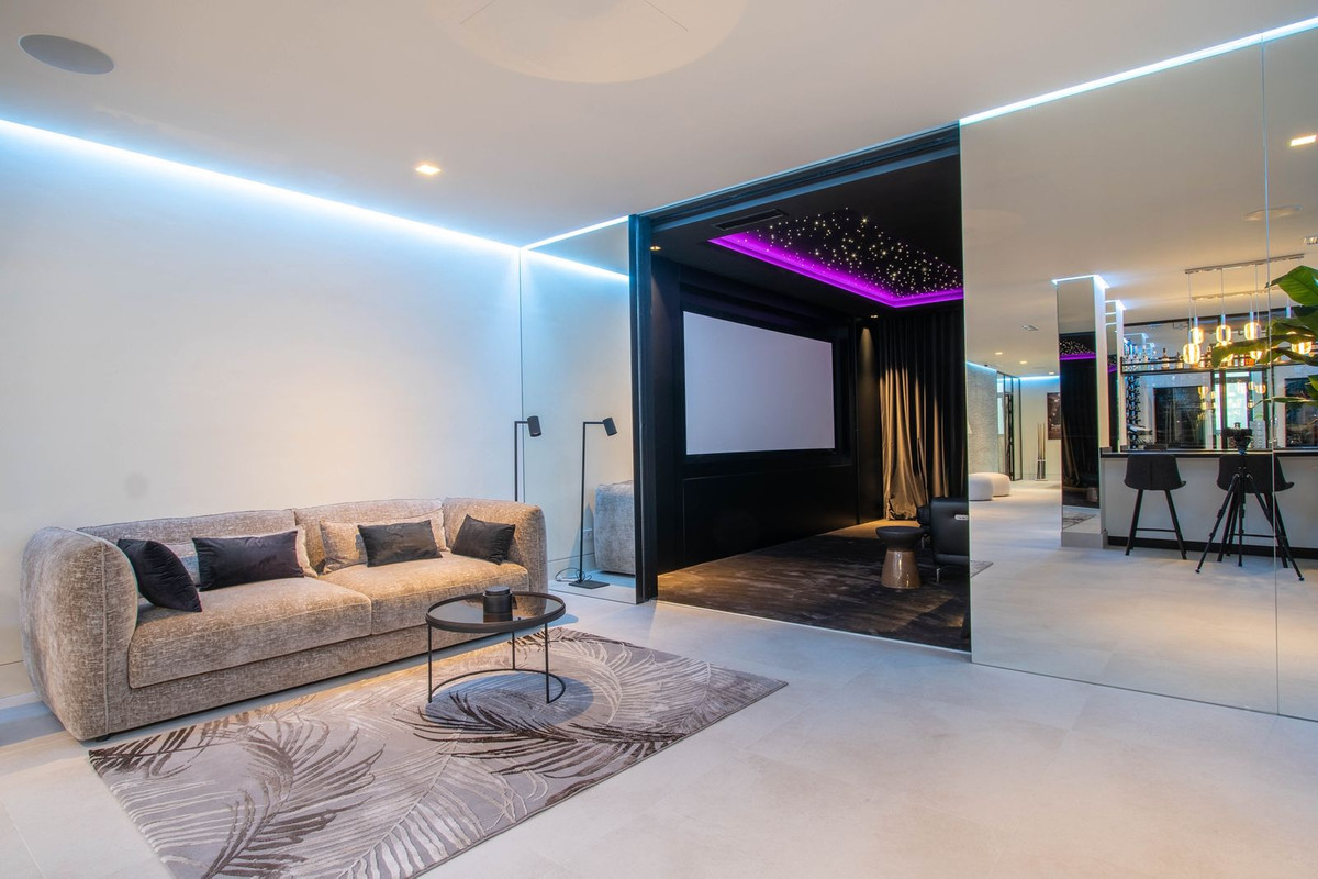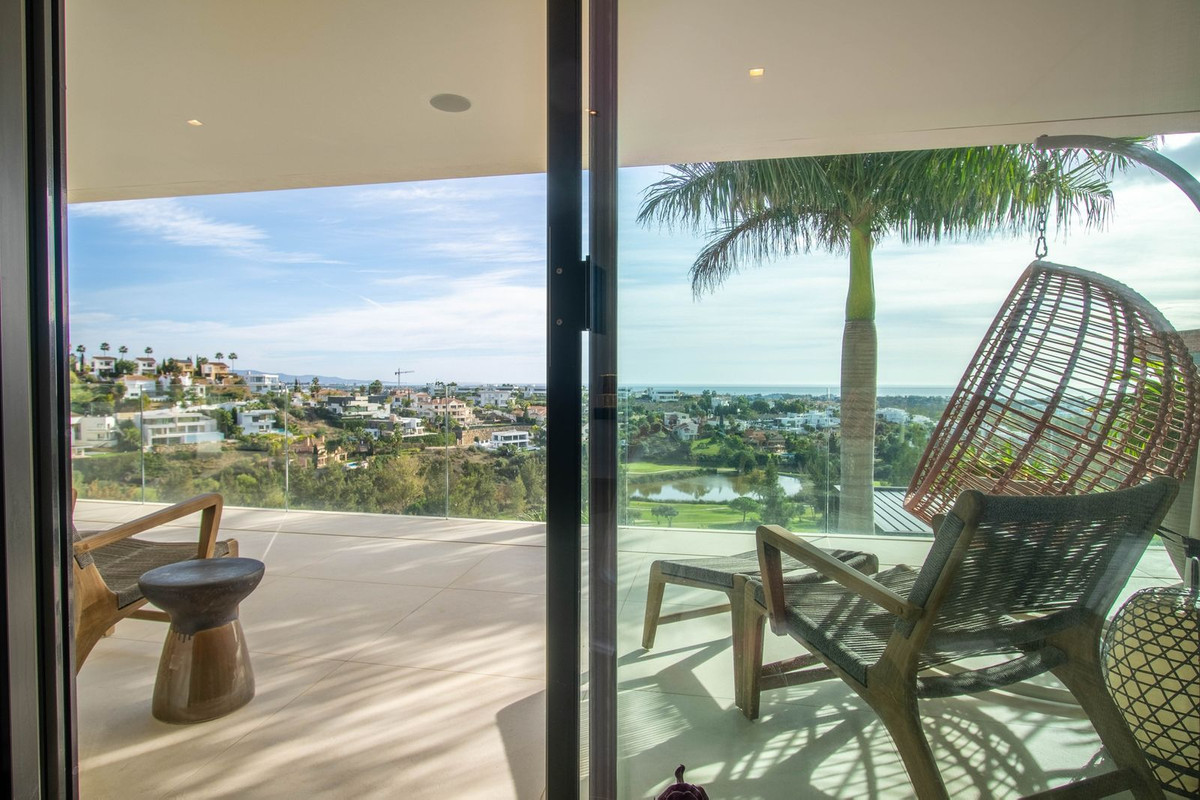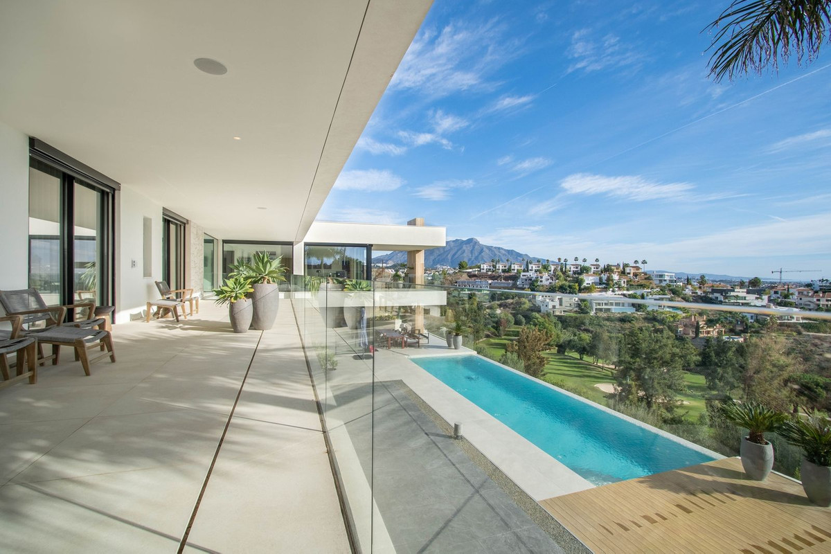 La propriété dispose également de spacieuses terrasses couvertes et découvertes avec vue panoramique sur la mer, la montagne et le golf, d'une incroyable piscine à débordement, d'un jacuzzi, d'une cuisine extérieure et d'un barbecue. La terrasse principale a été totalement transformée avec de nouveaux carrelages et des lumières LED qui peuvent être changées dans n'importe quelle couleur. .