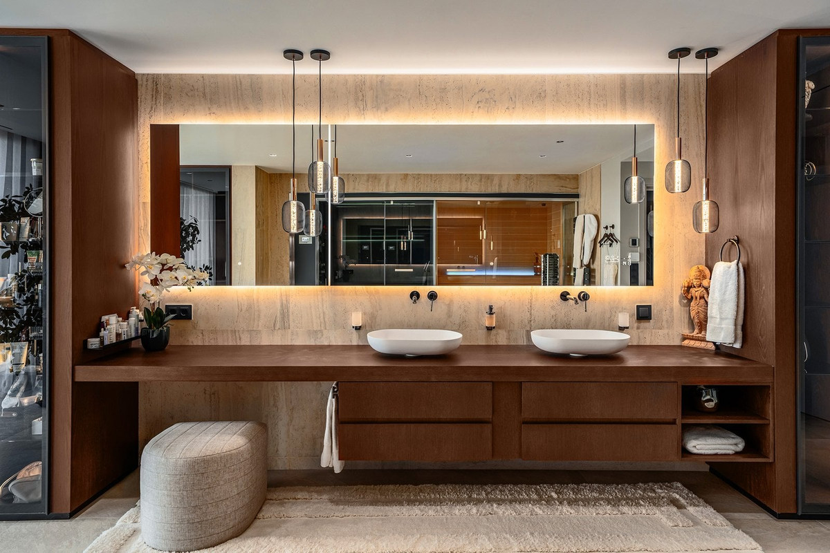 Au cœur de la maison se trouve un espace de vie soigneusement conçu, où la lumière naturelle et des matériaux de choix créent une atmosphère élégante et apaisante. La cuisine sur mesure, équipée d'appareils Gaggenau, s'intègre harmonieusement aux espaces salle à manger et salon, idéale pour le quotidien comme pour recevoir.