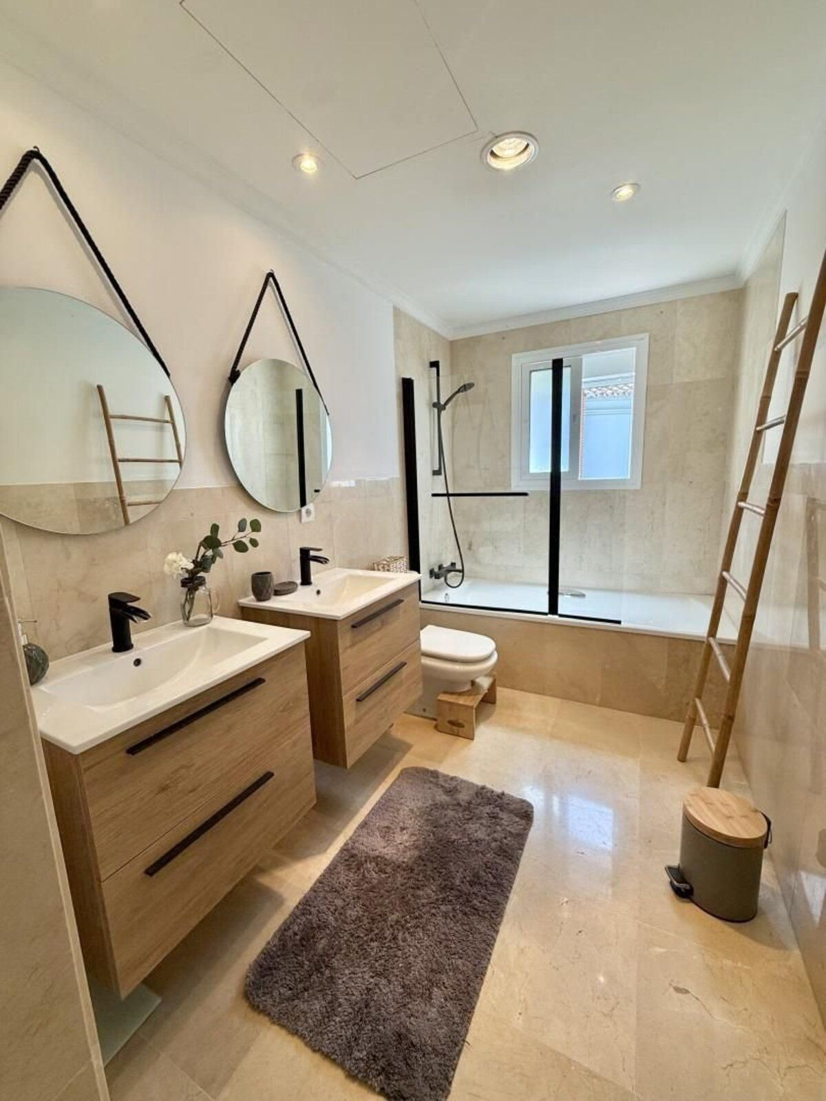 À l'étage, trois chambres et deux salles de bains entièrement rénovées, dont une suite parentale avec salle de bains attenante et un salon supplémentaire offrant une vue sur le golf de Miraflores et la mer.