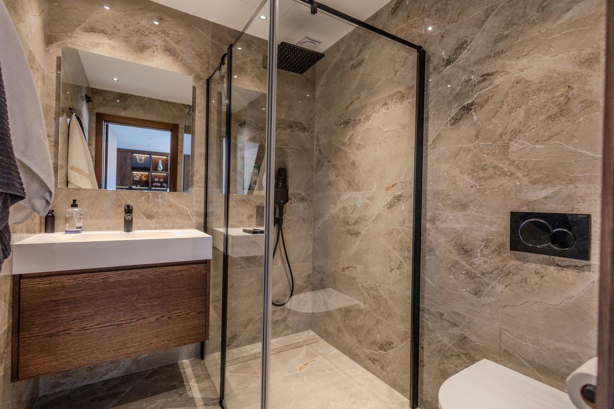 Les salles de bains modernes sont équipées d'un chauffage au sol pour un confort accru, tandis que l'appartement bénéficie également d'un rare garage pour deux voitures et d'un grand local de rangement privé.