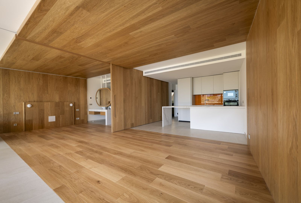 L'un des éléments de design les plus remarquables est le système de cloisons coulissantes de la chambre principale, qui permet d'ouvrir l'espace sur le salon, créant ainsi une ambiance loft élégante et ouverte, ou une intimité totale selon les besoins.
