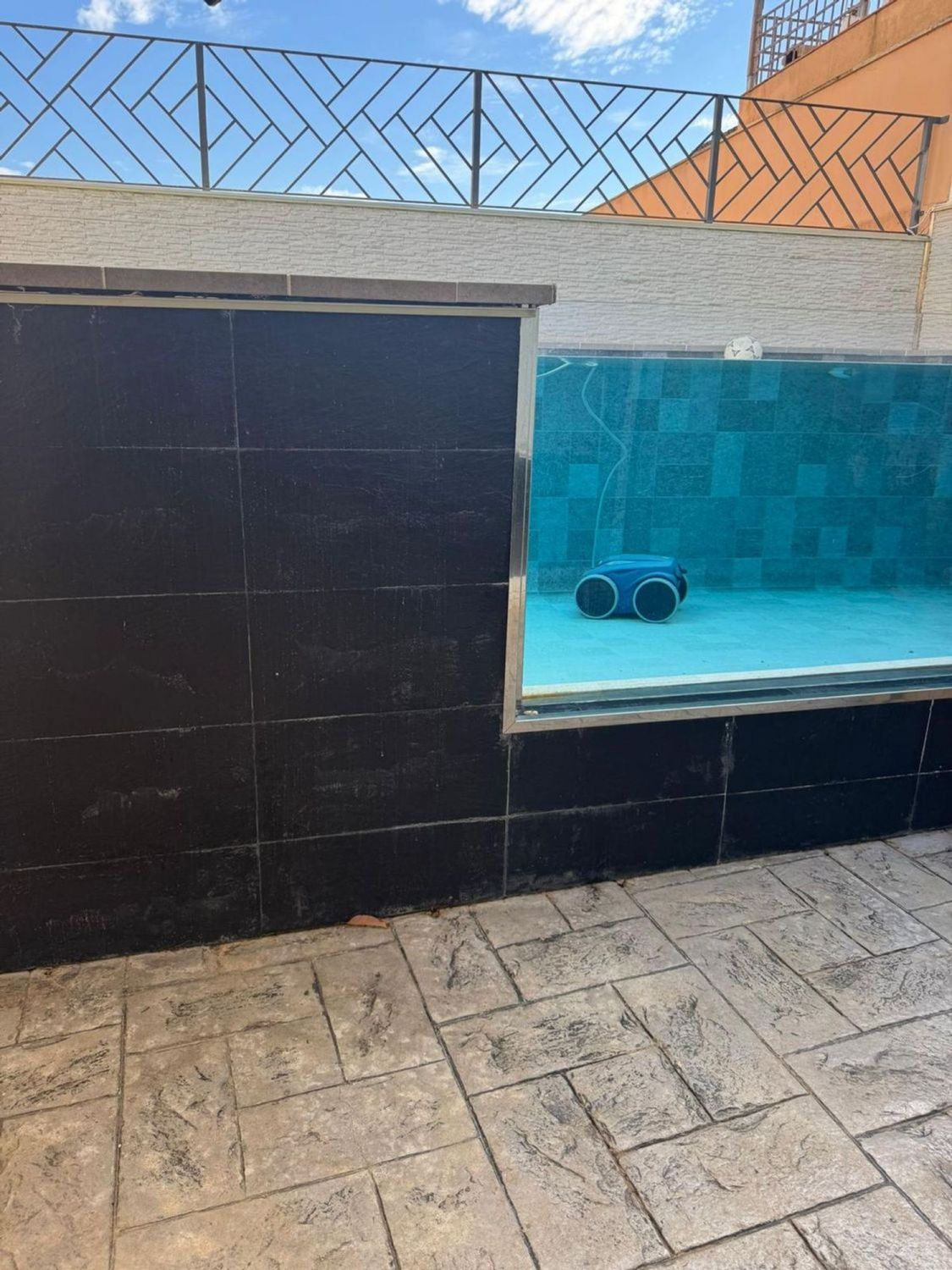 Un espace extérieur avec béton imprimé et piscine design d'eau salée, idéal pour se détendre ou partager des moments en famille ou entre amis.