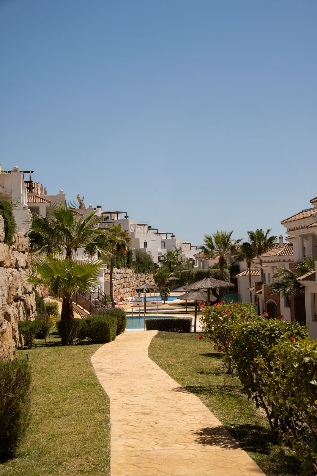 Residents benefit from beautifully maintained gardens, multiple swimming pools, and a peaceful yet well-connected location.