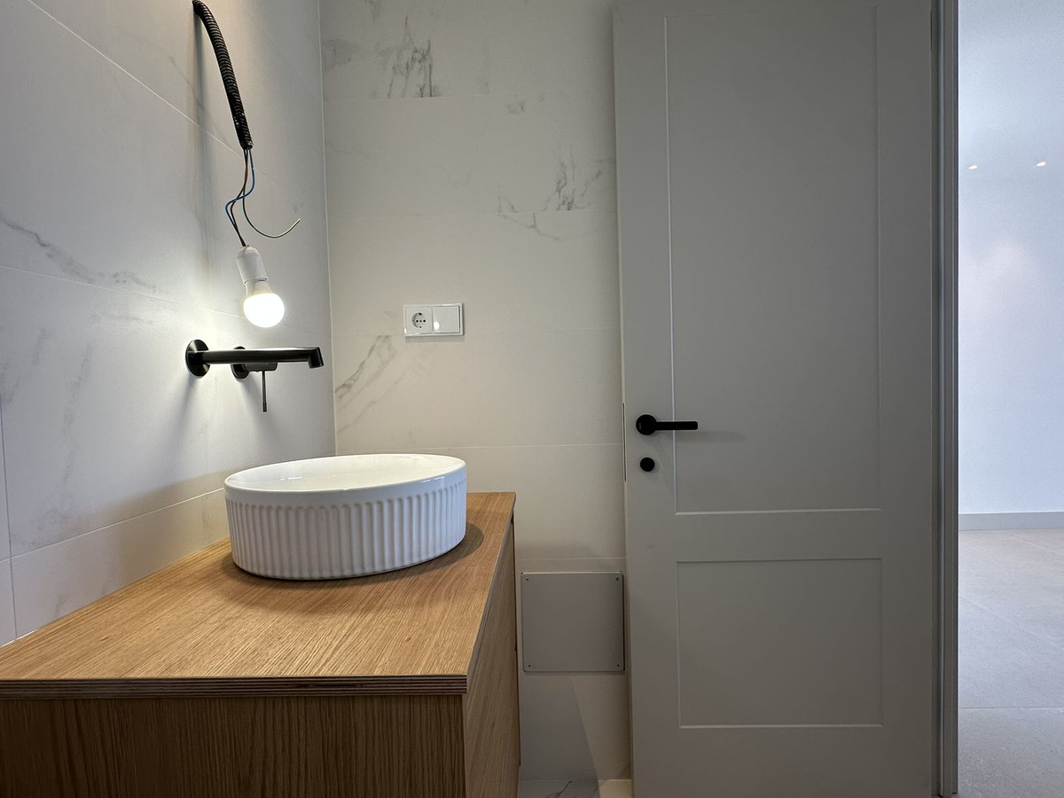 Les salles de bains sont équipées d'un chauffage au sol (sauf dans les toilettes pour invités) et d'installations modernes avec robinets thermostatiques et réservoirs encastrés, offrant un design épuré et fonctionnel.