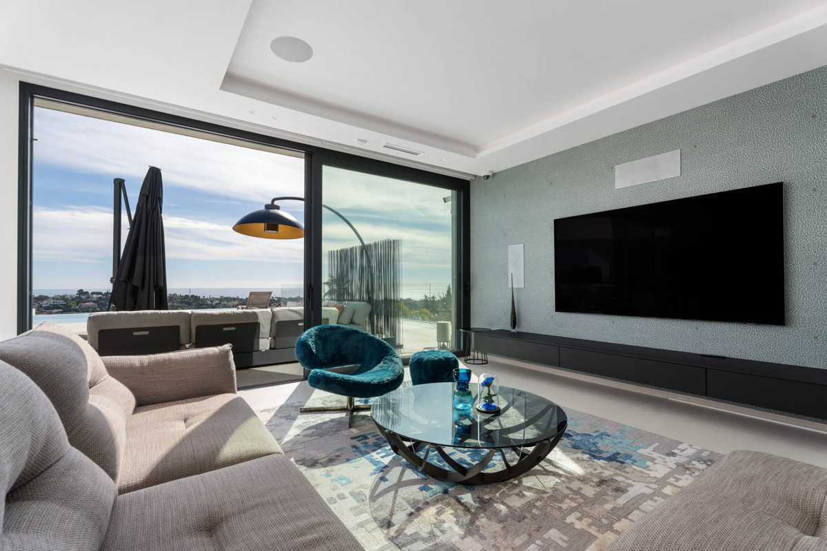 La propriété s'étend sur plusieurs niveaux reliés par un ascenseur et offre de généreux espaces intérieurs baignés de lumière naturelle. Au rez-de-chaussée, les pièces à vivre s'ouvrent sur la terrasse et le jardin grâce à de larges baies vitrées qui créent une continuité entre l'intérieur et l'extérieur. La piscine à débordement se prolonge jusqu'à l'horizon, renforçant ainsi l'impression de continuité avec le paysage.