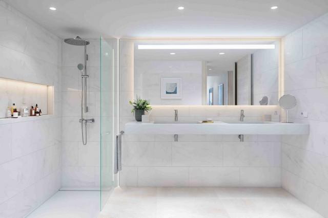 La conception des appartements utilise au maximum la lumière naturelle, avec des pièces spacieuses et des lignes ouvertes en général. Cuisine entièrement équipée avec appareils Neff et comptoirs Sileston, salles de bains avec sols et carrelages de Gunni & Trentino.