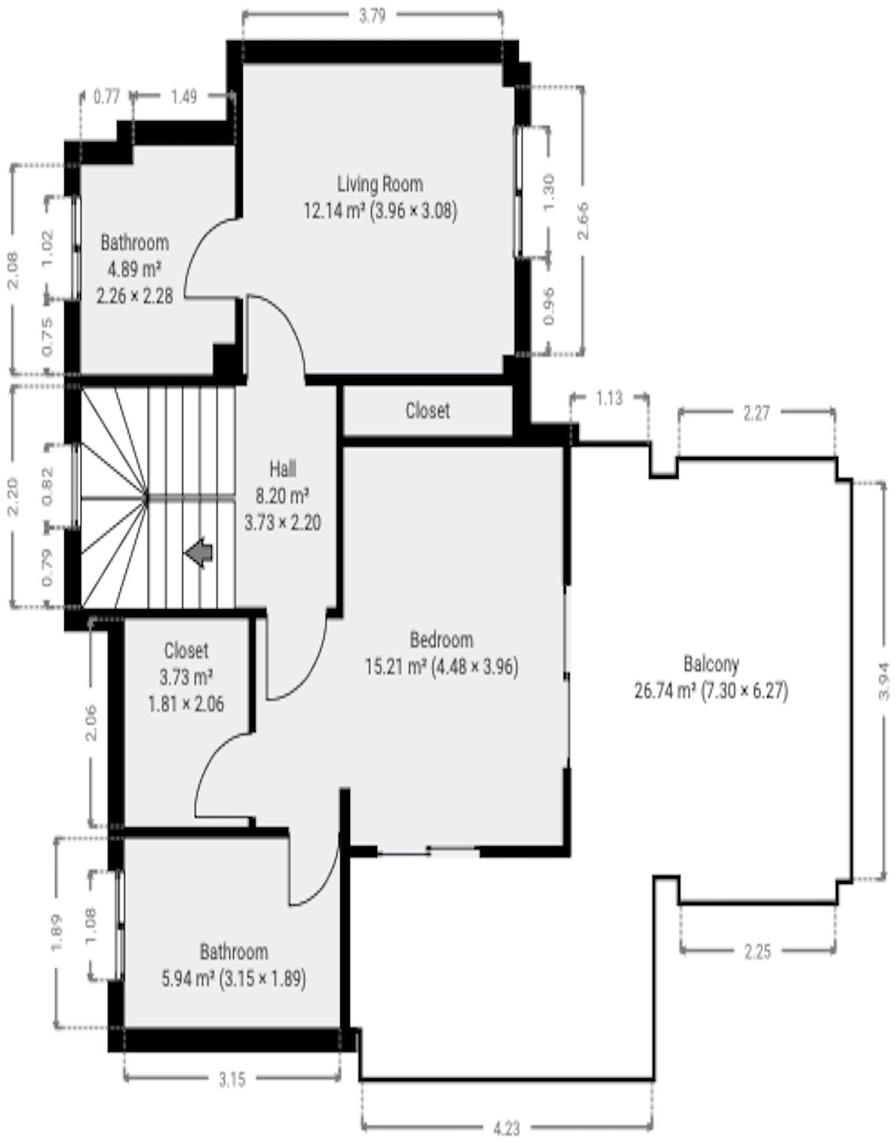 On the ground floor is the fully equipped kitchen which gets an abundance of natural sunlight and is excellent for making delicious meals, as well as the first open-plan dining/living room. From here, there is direct access to one of the terraces, which overlooks the garden and private pool. There is also one bathroom and a bedroom on this floor.
