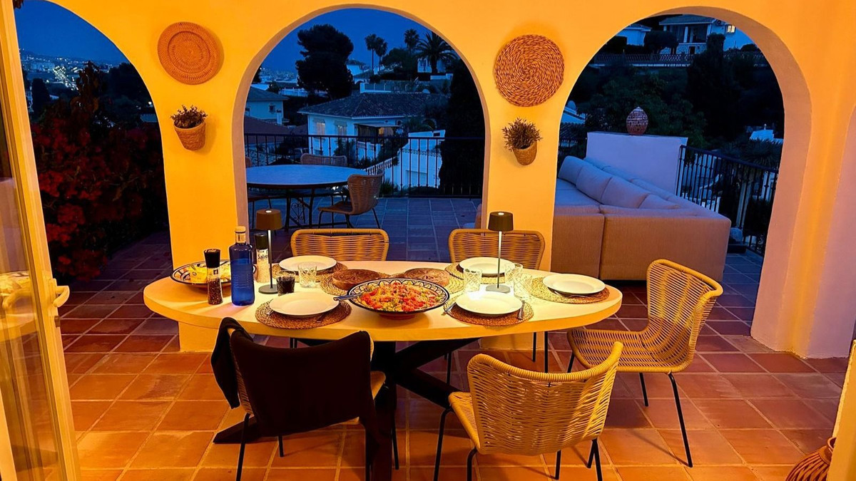 GOING UP TO THE VILLA YOU ARE MET WITH A LARGE OPEN TERRACED SEATING AREA WITH OUTDOOR SOFAS AND COFFE TABLE, WITH AMAZING VIEWS OF THE MOUNTAINS AND COUNTRY SIDE.