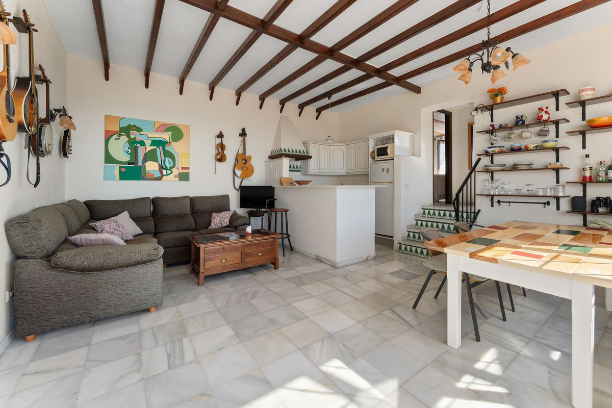 Dream of sipping your morning coffee while the Mediterranean shimmers in front of you? Step onto the 25 m², south-facing terrace of this Nuevo Pueblo townhouse and that’s exactly the start to every day. The space is wide enough for dining and lounging zones, fitted with a built-in stone barbeque, and—best of all—has its own gate that swings straight onto the communal pool deck, so the kids (or the sangria) never have far to travel. From here the sea stretches blue to the horizon, a view shared by the living room thanks to wall-to-wall patio doors.