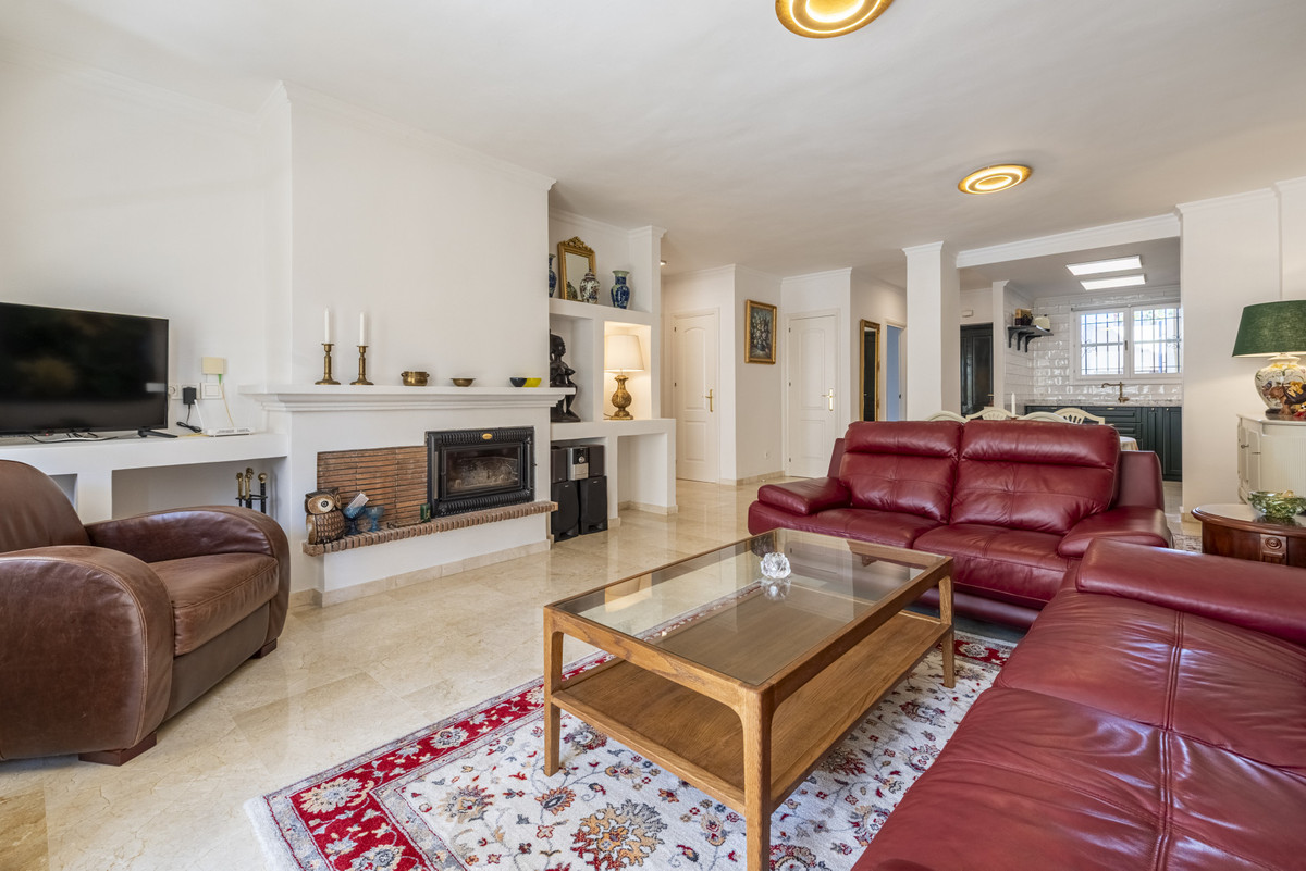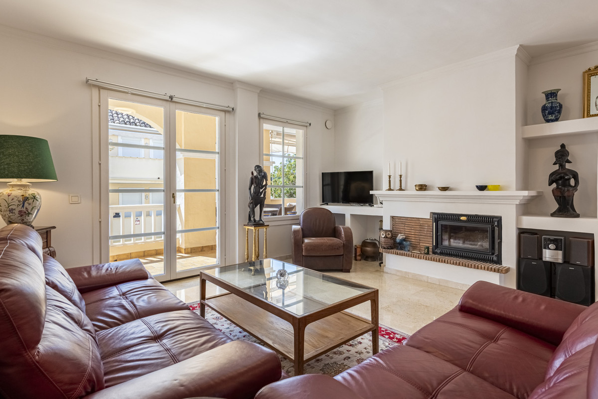 Dès l'entrée, vous serez accueilli par un spacieux et lumineux séjour-salle à manger ouvert. Son agencement généreux est idéal pour se détendre ou recevoir, avec un élégant sol en marbre, des murs blancs immaculés et une cheminée chaleureuse qui ajoute du charme à l'espace. De grandes portes-fenêtres centrales s'ouvrent sur une magnifique terrasse exposée plein sud donnant sur les magnifiques jardins communs paysagers, un endroit idéal pour prendre un café le matin, bronzer ou dîner en plein air.