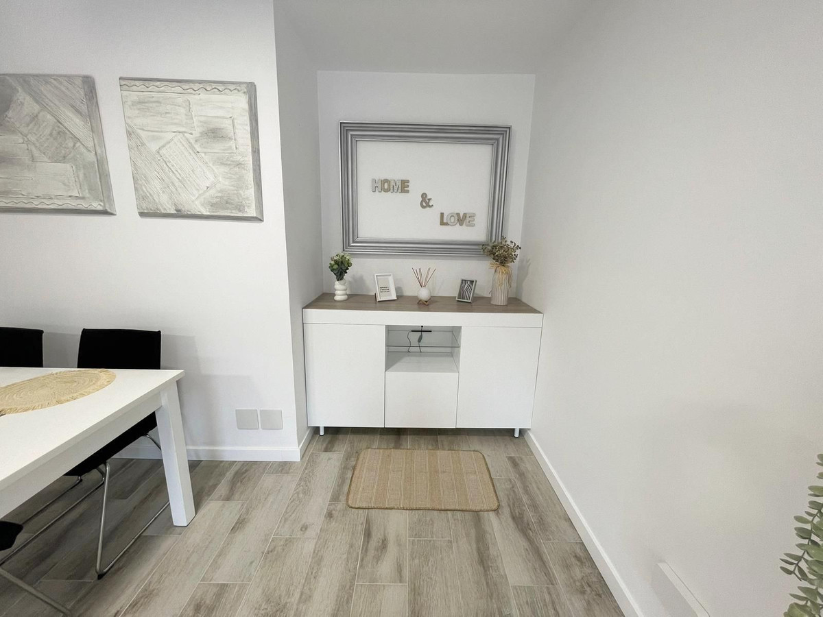 Le salon-salle à manger est très cosy, idéal pour se détendre après une journée à la plage. La cuisine est entièrement équipée et dispose de placards intégrés optimisant l'espace de rangement.
