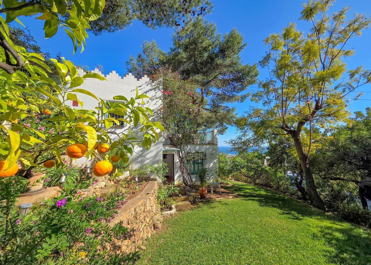 À l'intérieur, un hall d'entrée accueillant aux plafonds en bois mansardés donne le ton à l'élégance de la maison. À gauche, un salon lumineux et aéré, avec cheminée, baigne de lumière, créant une atmosphère chaleureuse et accueillante. La cuisine, pleine de caractère et aux couleurs vibrantes, s'ouvre sur une spectaculaire terrasse suspendue offrant une vue imprenable sur la mer, joliment encadrée par des bougainvilliers et des jacarandas – un endroit idéal pour savourer des repas en plein air ou simplement s'imprégner de l'atmosphère méditerranéenne.