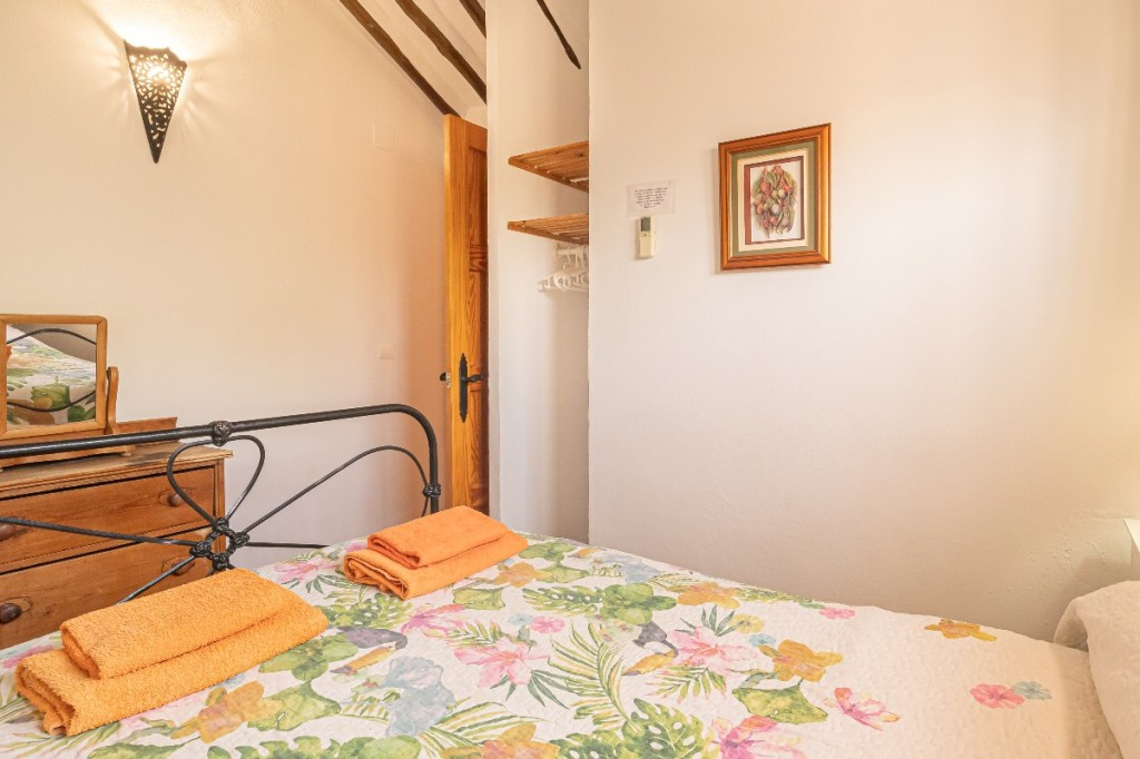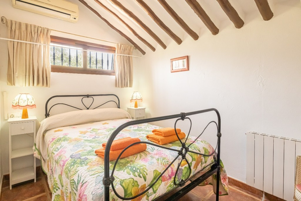 House No. 2, located opposite the barbecue and pool house, consists of a living room with high ceilings and wood beams, a separate, equipped kitchen with a dining table and fireplace, a bedroom, and a bathroom.
