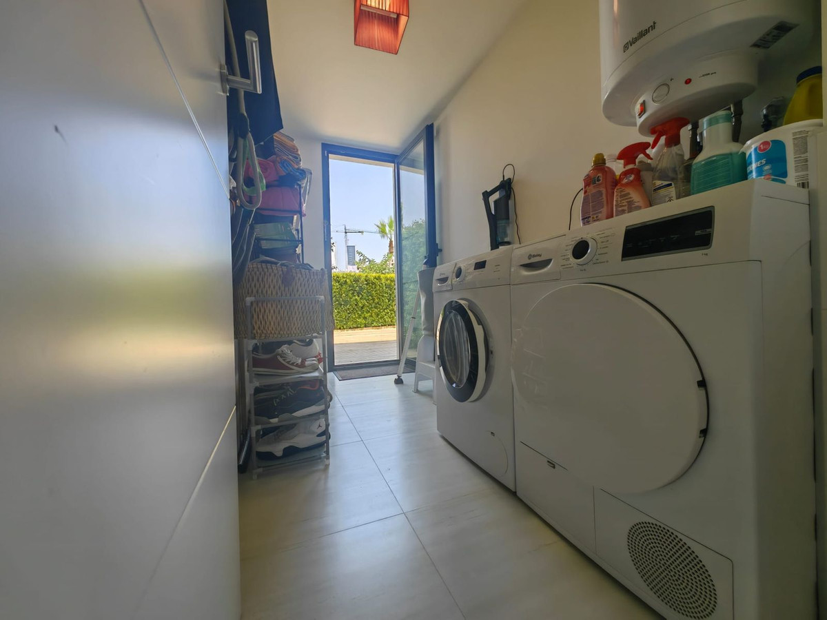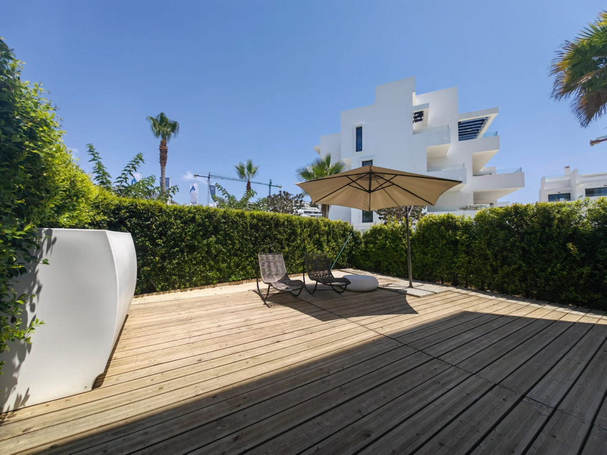 Le séjour lumineux et ouvert s'ouvre sur une grande terrasse semi-couverte exposée plein sud avec vue partielle sur la mer, créant ainsi un cadre idéal pour profiter du soleil de la Costa del Sol tout au long de la journée. À l'arrière, un jardin privé avec terrasse en bois offre un havre de paix, idéal pour les repas en plein air, les barbecues ou tout simplement pour se détendre.