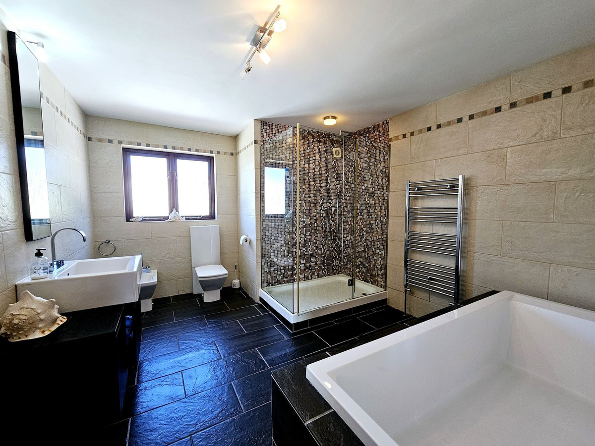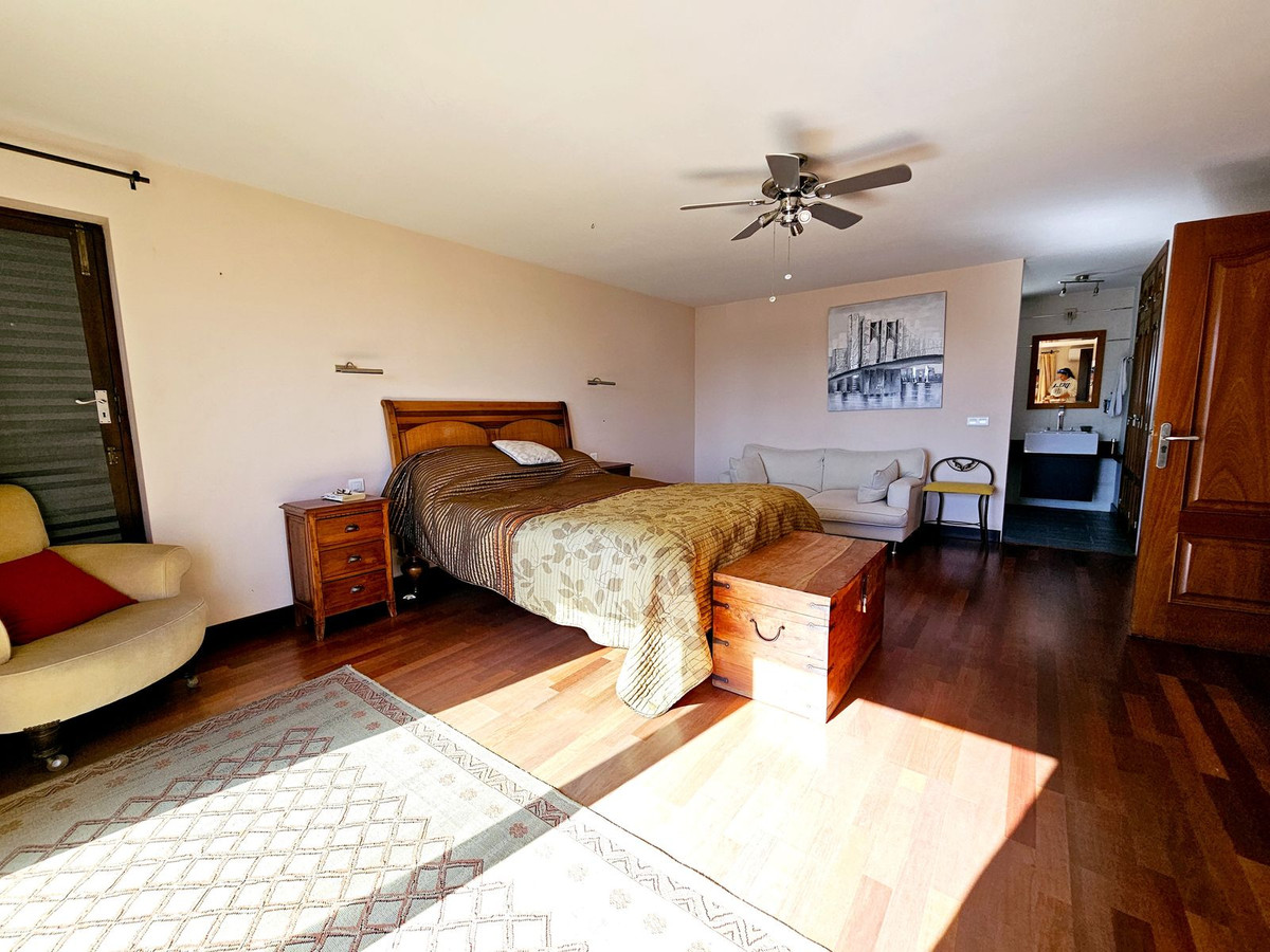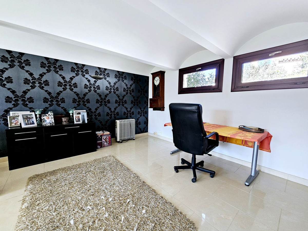 En entrant dans la villa, vous êtes accueilli par une magnifique porte d'entrée andalouse en bois qui s'ouvre sur un hall. À droite, vous trouverez un salon spacieux et lumineux, un bureau, une grande chambre et une salle de bain complète. À gauche, un second salon/coin TV, une cuisine américaine entièrement équipée et un coin repas donnant directement sur les terrasses couvertes et découvertes ainsi que sur le jardin. À l'étage, vous découvrirez la grande suite parentale avec salle de bain attenante, terrasse privée et accès direct au jardin. Trois autres chambres se trouvent également à l'étage, dont une avec terrasse privée. Toutes sont spacieuses et partagent une grande salle de bain avec baignoire et douche. Un espace non aménagé entre deux chambres pourrait facilement être transformé en salle de bain communicante si nécessaire. Toutes les chambres sont climatisées (chaud/froid).
