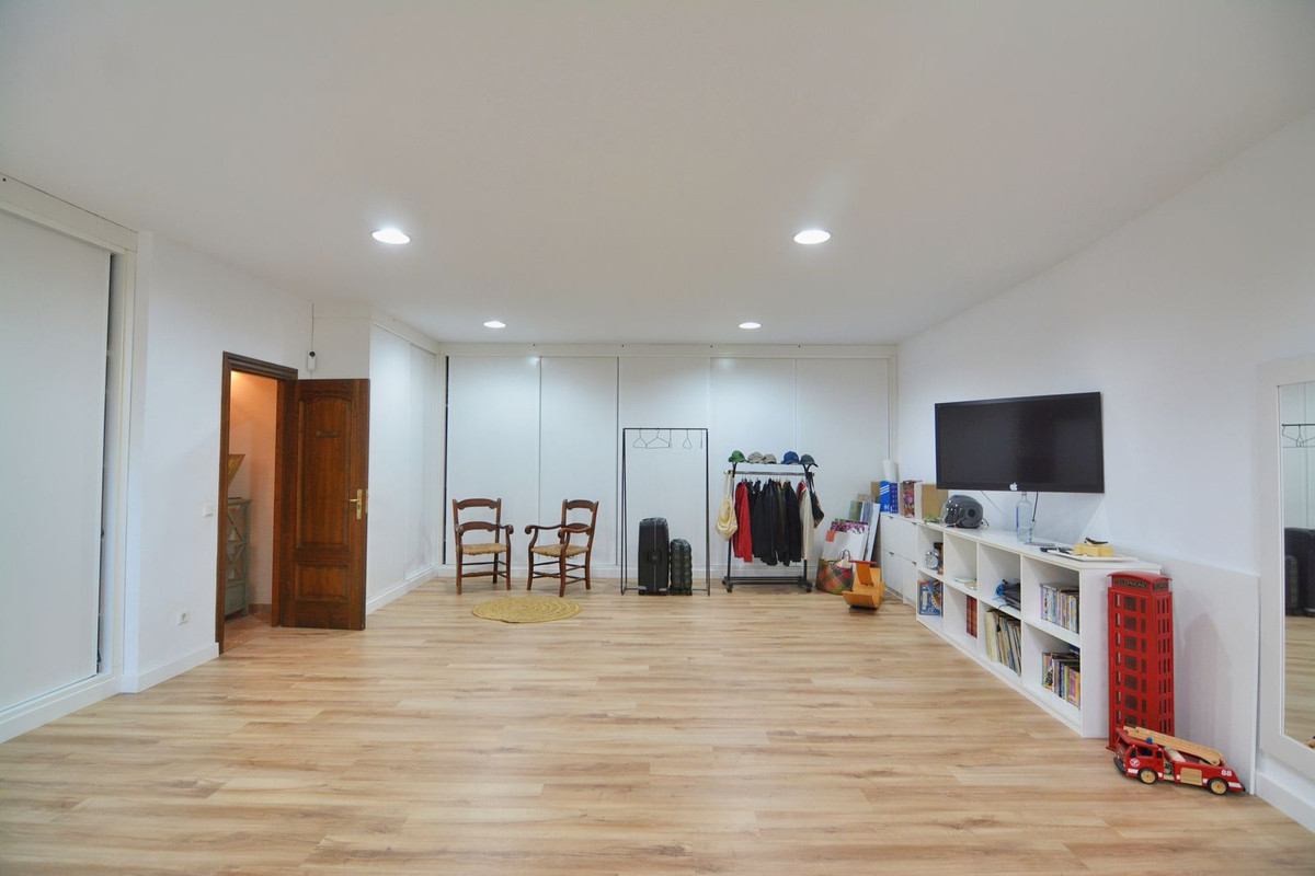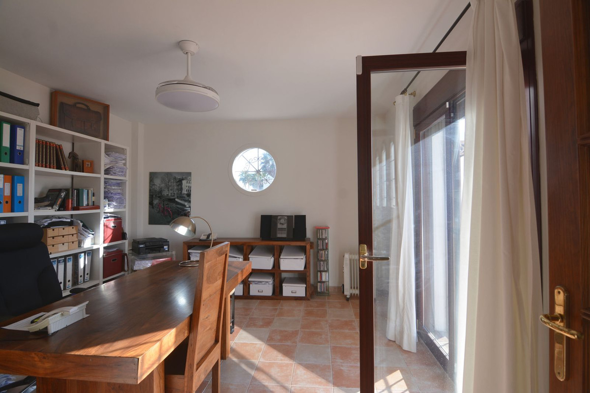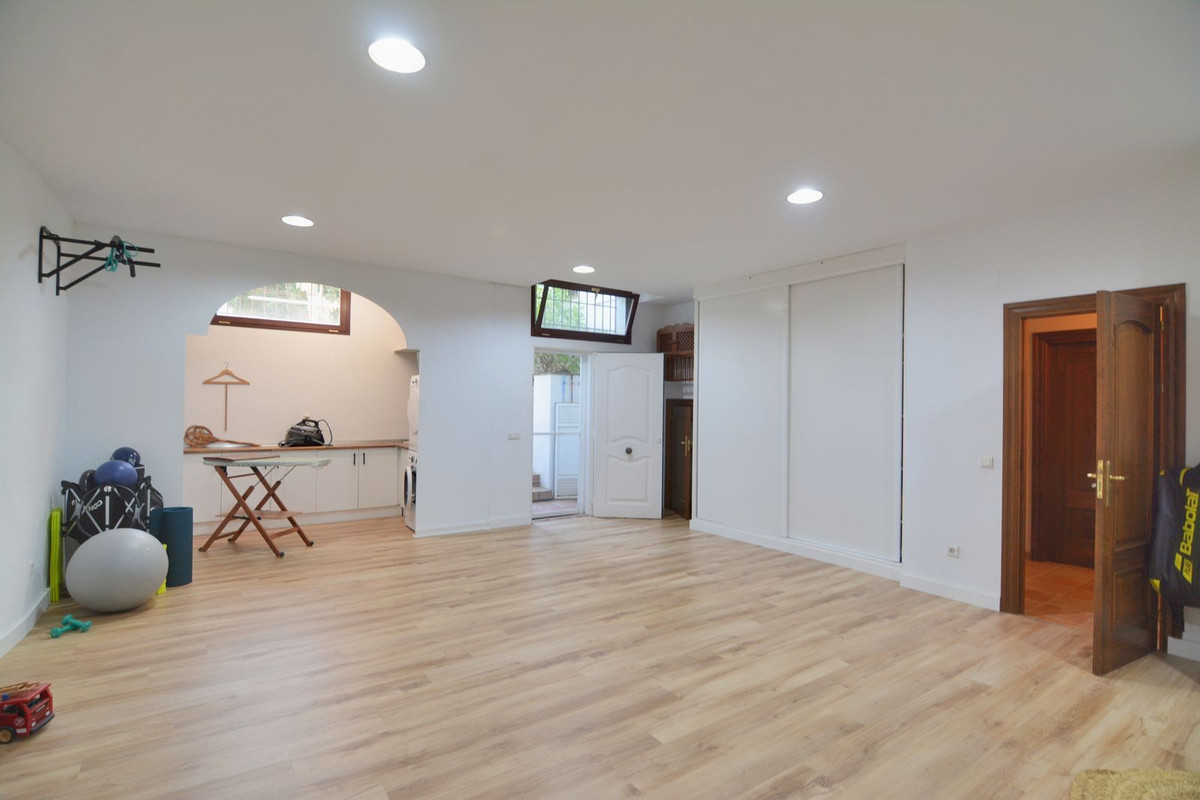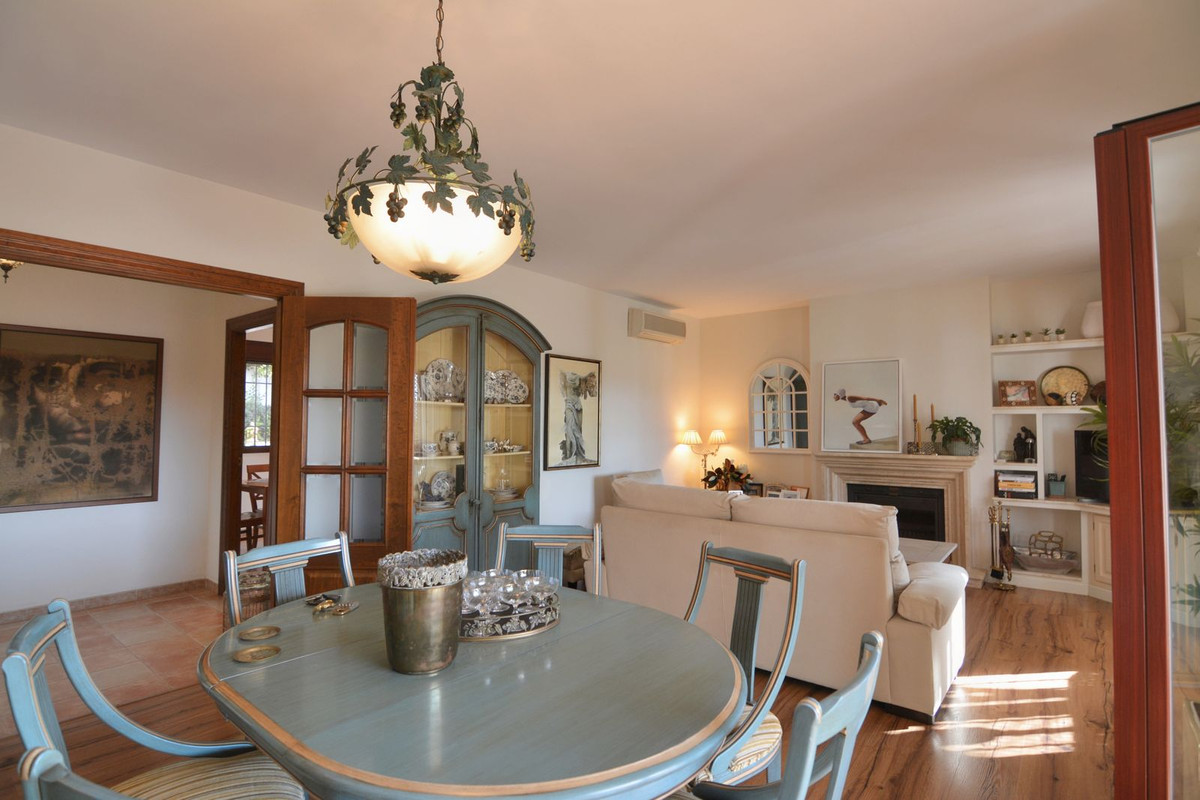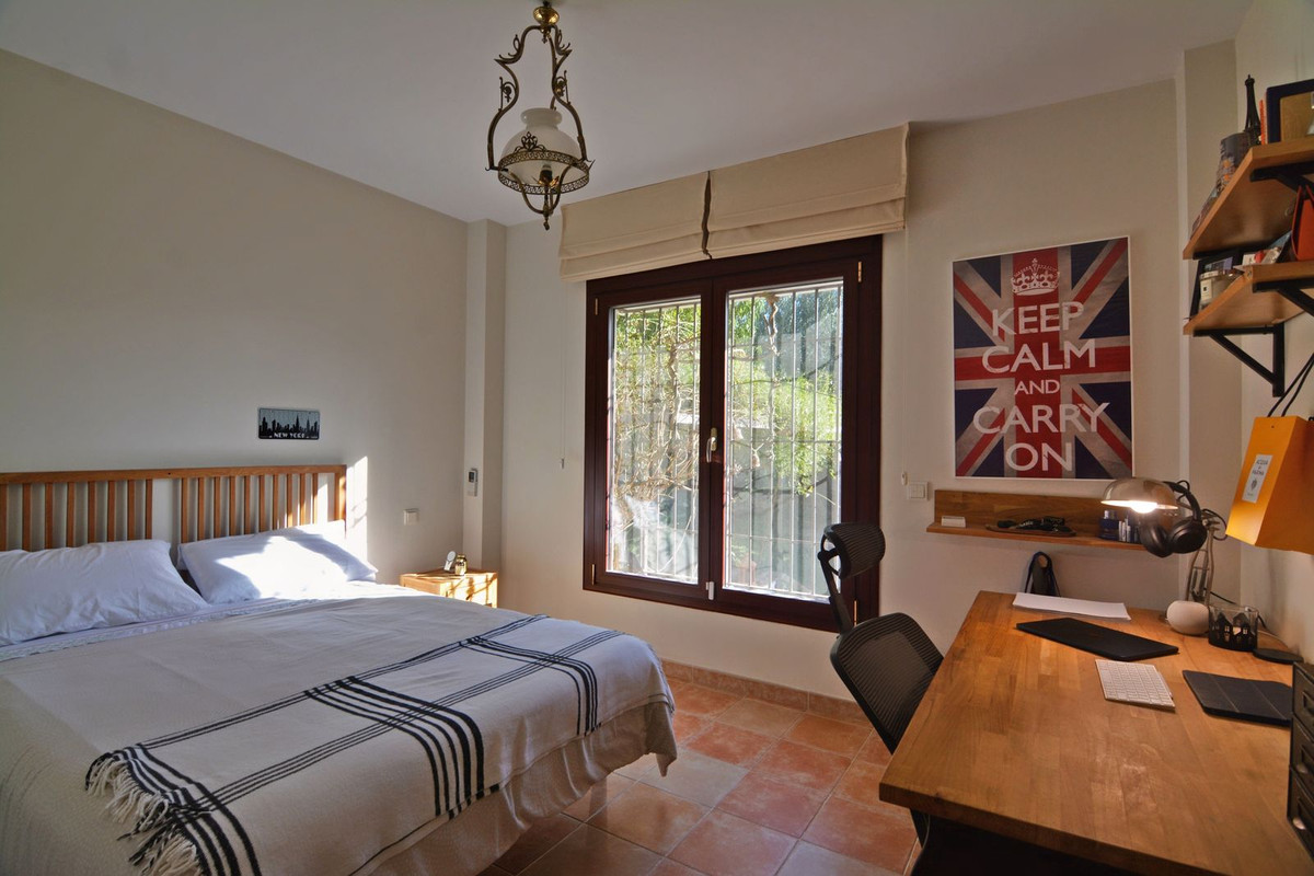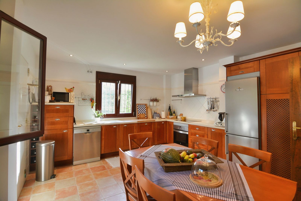 La propriété se situe sur un terrain de 858 m² avec un jardin arboré et une piscine privée, idéal pour profiter du climat ensoleillé de la Costa del Sol. Au rez-de-chaussée, un séjour spacieux et lumineux, donnant directement sur une véranda couverte, invite à la détente et aux moments conviviaux en plein air. La cuisine indépendante, grande et fonctionnelle, s'ouvre sur une charmante terrasse arrière, parfaite pour les petits-déjeuners ensoleillés. Ce niveau comprend également des toilettes invités.