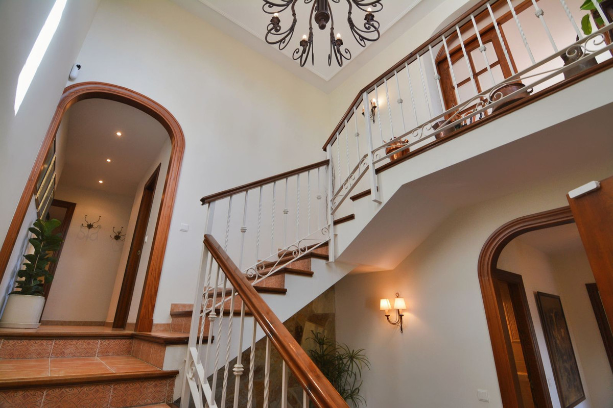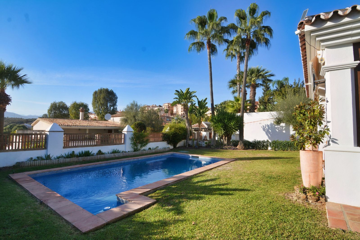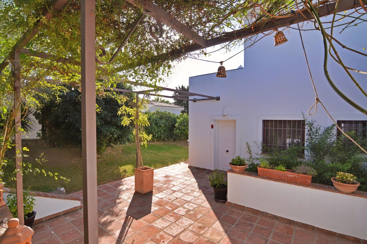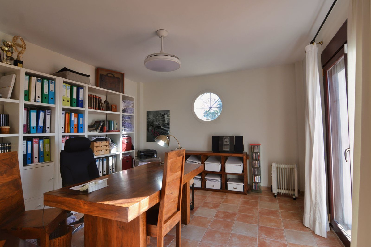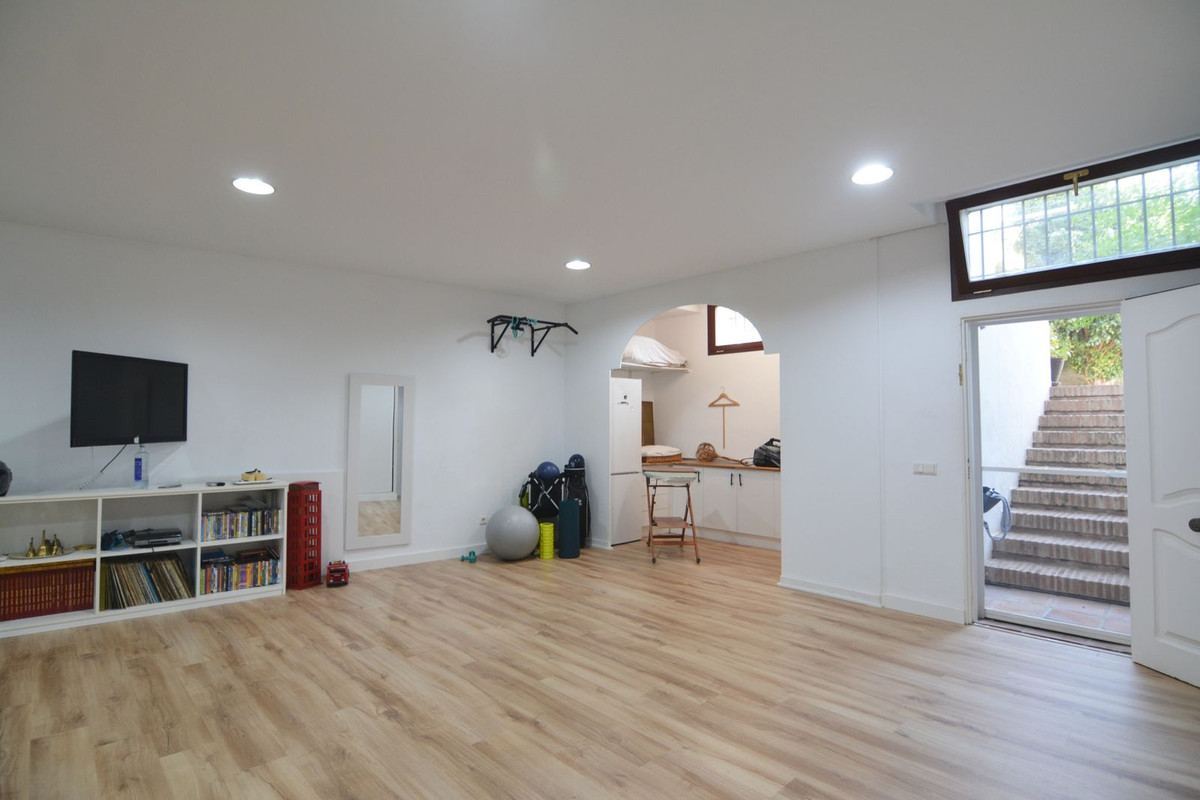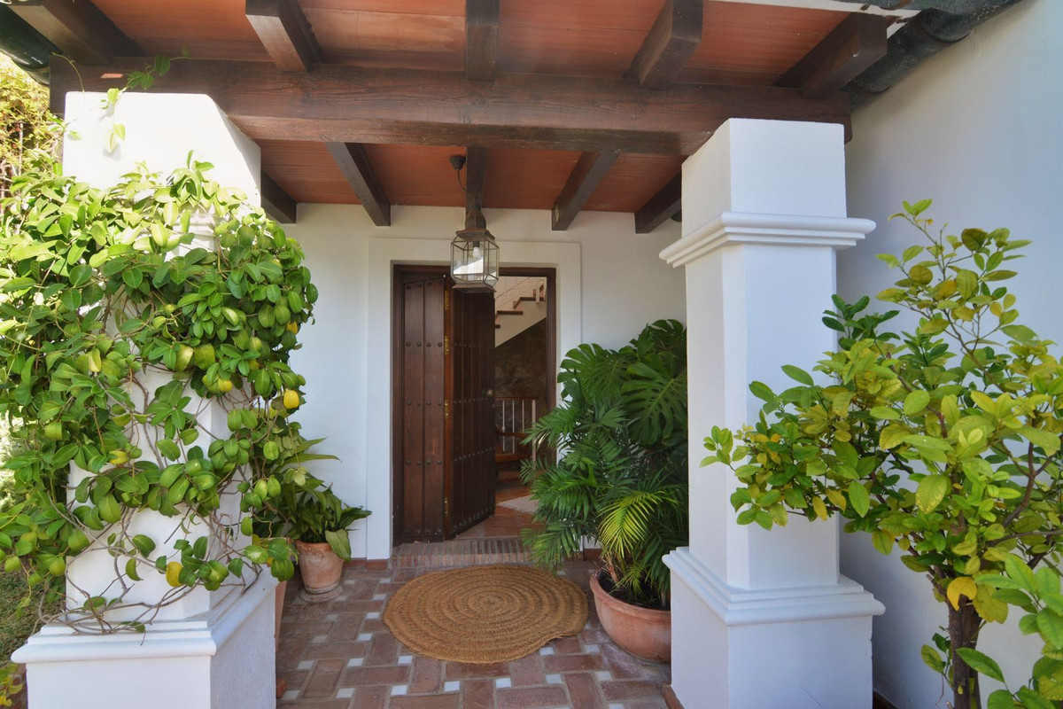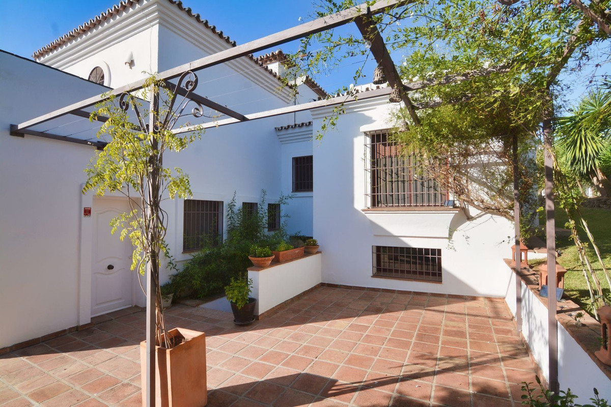 La propriété se situe sur un terrain de 858 m² avec un jardin arboré et une piscine privée, idéal pour profiter du climat ensoleillé de la Costa del Sol. Au rez-de-chaussée, un séjour spacieux et lumineux, donnant directement sur une véranda couverte, invite à la détente et aux moments conviviaux en plein air. La cuisine indépendante, grande et fonctionnelle, s'ouvre sur une charmante terrasse arrière, parfaite pour les petits-déjeuners ensoleillés. Ce niveau comprend également des toilettes invités.
