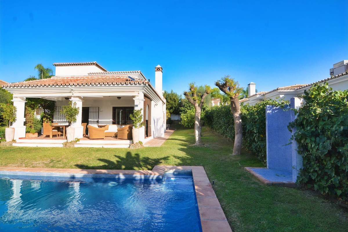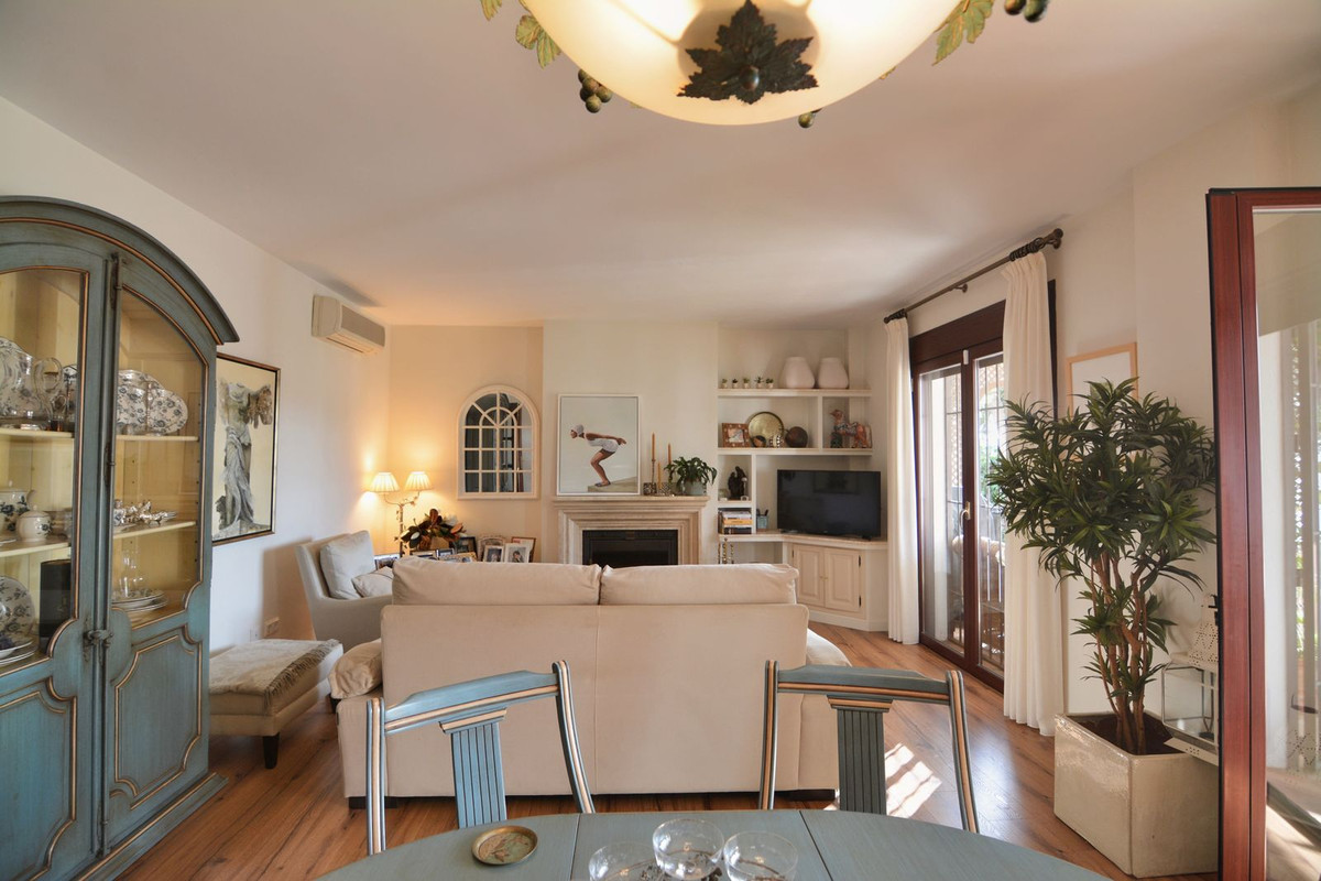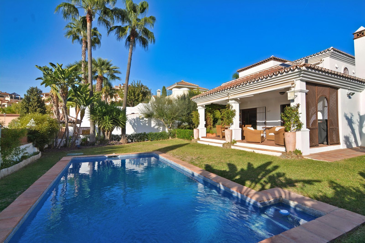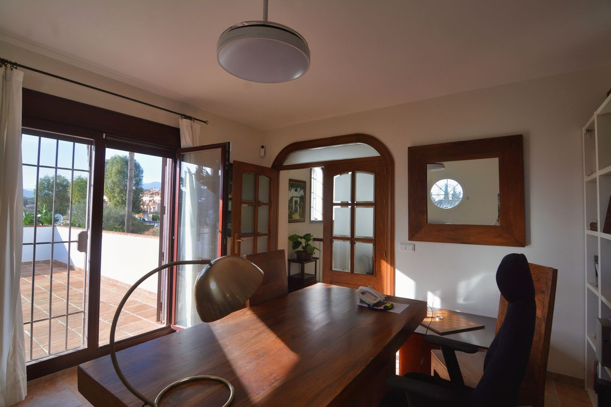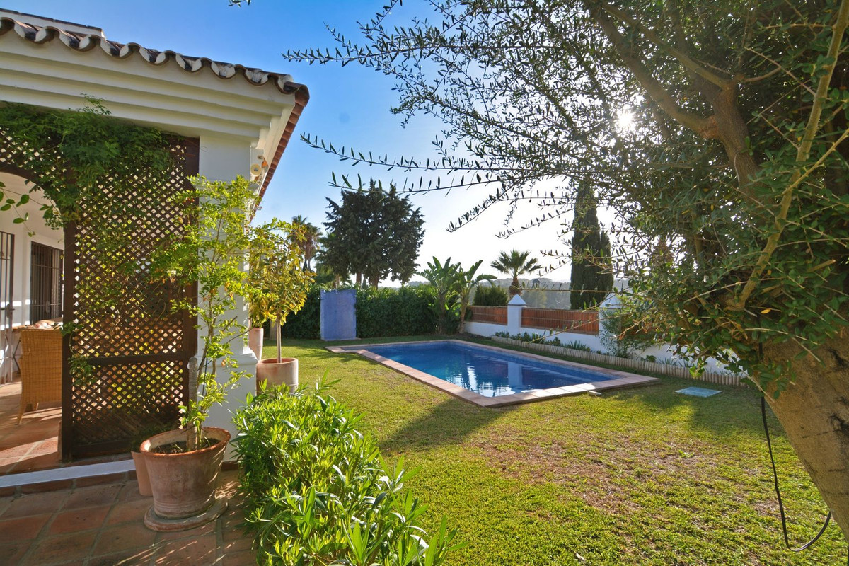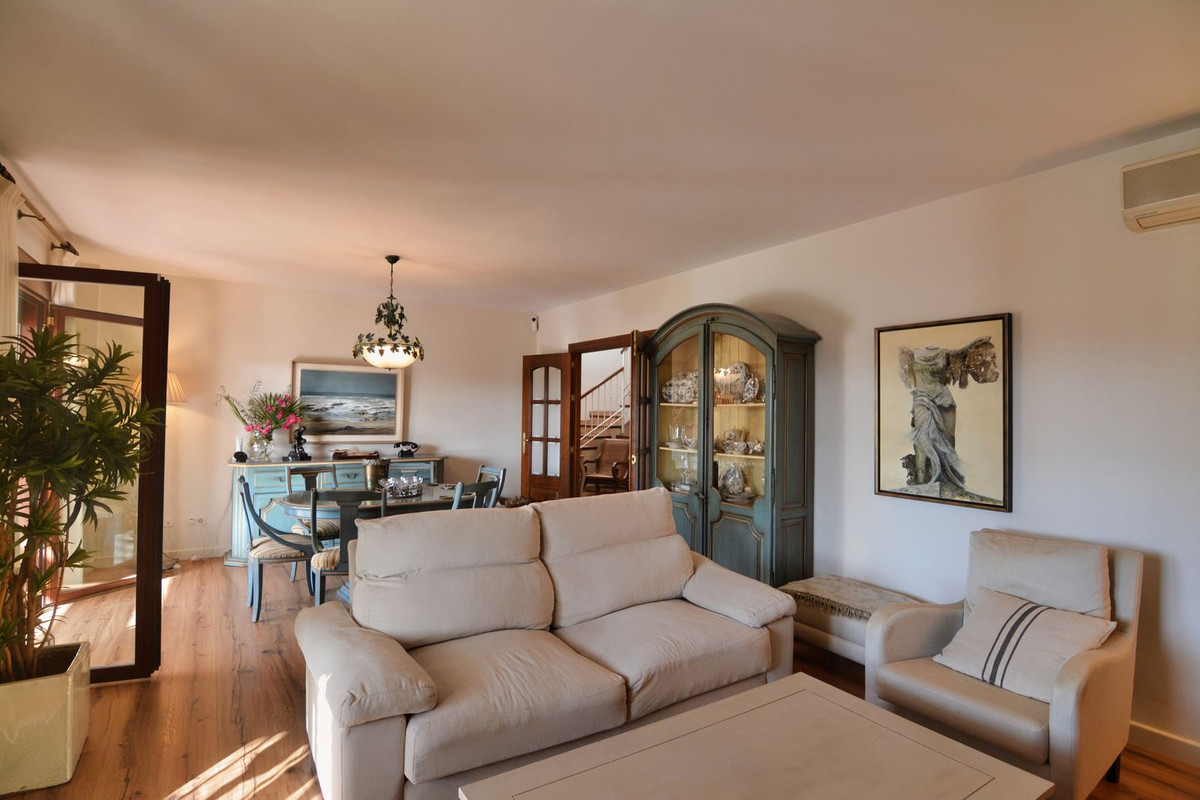 La propriété se situe sur un terrain de 858 m² avec un jardin arboré et une piscine privée, idéal pour profiter du climat ensoleillé de la Costa del Sol. Au rez-de-chaussée, un séjour spacieux et lumineux, donnant directement sur une véranda couverte, invite à la détente et aux moments conviviaux en plein air. La cuisine indépendante, grande et fonctionnelle, s'ouvre sur une charmante terrasse arrière, parfaite pour les petits-déjeuners ensoleillés. Ce niveau comprend également des toilettes invités.