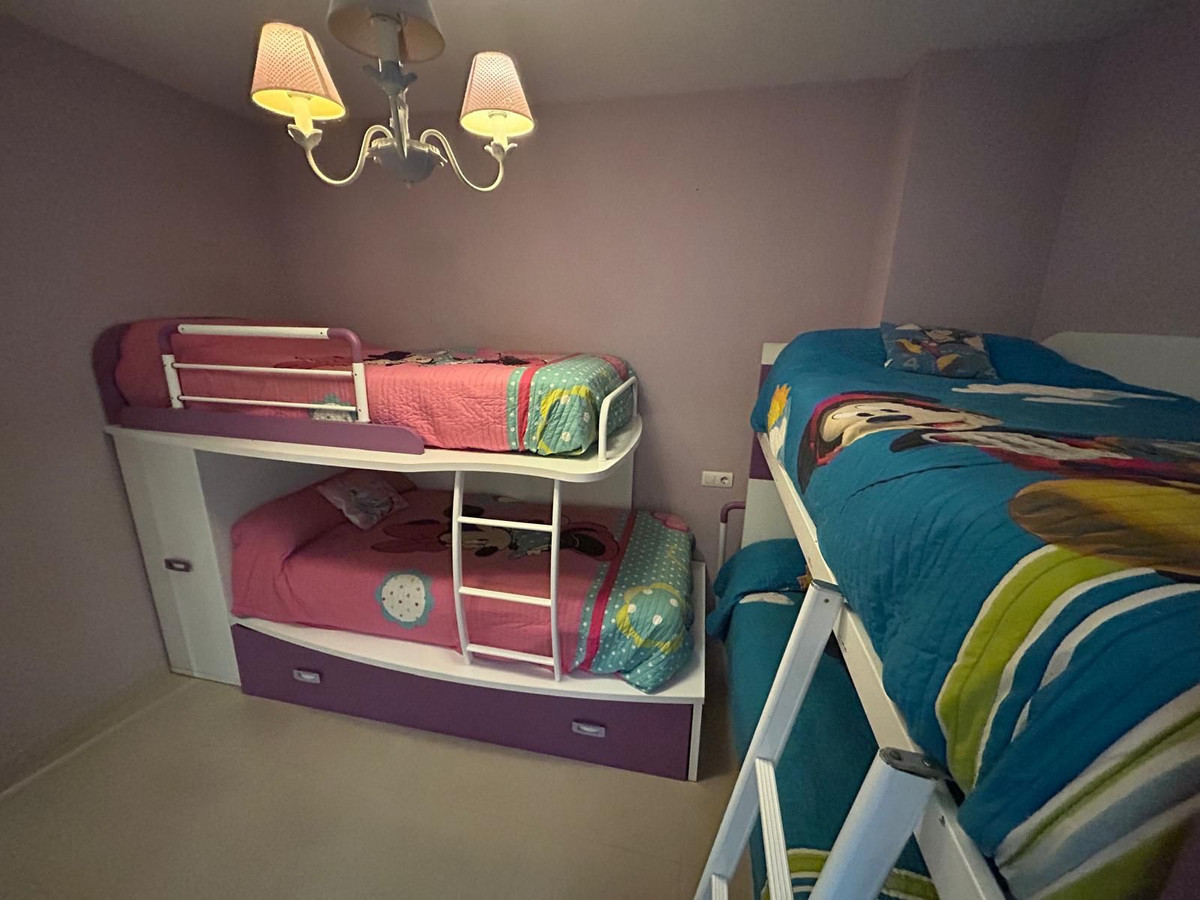 Appartement de plain-pied à vendre, 66 m², à Fuengirola, Málaga. Cet appartement se situe à seulement 100 mètres de la plage d'El Galgo (quartier portuaire) et à 100 mètres du centre de Fuengirola (Plaza La Constitución). Il bénéficie d'un emplacement privilégié, à proximité immédiate des commerces, restaurants et commodités. L'arrêt de bus est à 150 mètres et la gare à 200 mètres. L'appartement est entièrement climatisé. Il comprend une salle de bain complète avec douche et fenêtre donnant sur le patio, un séjour spacieux avec deux fenêtres, une cuisine américaine entièrement équipée, une chambre principale climatisée avec fenêtre, et une deuxième chambre avec deux lits superposés et un lit gigogne, pouvant accueillir confortablement 5 personnes. Des armoires et un placard intégré sont également présents. Un patio semi-couvert avec un espace buanderie complète l'appartement. Le prix inclut une place de parking privée et un local de rangement dans le même immeuble.