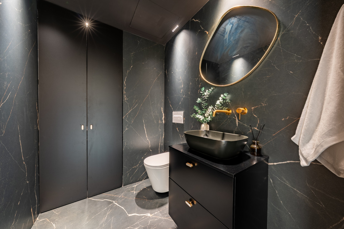 À l'étage, la suite parentale sereine et les chambres d'amis allient confort et style, sublimés par des matériaux raffinés et des tons doux et neutres.