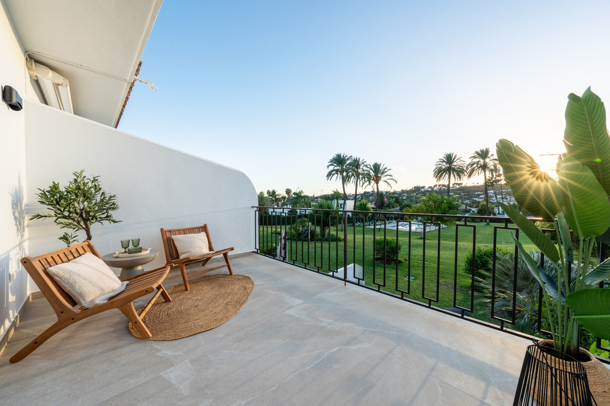 Nichée au cœur de jardins tropicaux luxuriants et agrémentée d'une magnifique piscine commune, cette maison offre un parfait mélange de tranquillité et de commodités, à quelques minutes de terrains de golf de renommée mondiale, de boutiques chics et de la vie animée de Puerto Banús.