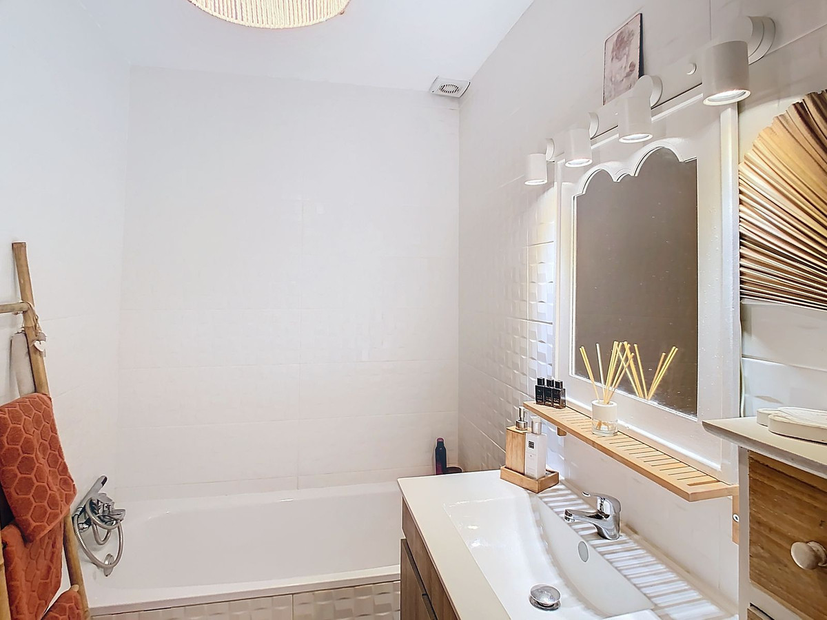 Cette maison de ville est accessible par quelques larges marches et dispose de places de stationnement dans la rue ainsi que dans deux grands parkings publics. Dès votre arrivée, vous découvrirez un espace de rangement d'environ 10 m². Quelques marches mènent à la première terrasse. Ce bien offre un confort moderne, notamment une installation électrique neuve au rez-de-chaussée, gage de sécurité et de praticité. Un élégant revêtement de sol neuf habille l'ensemble du rez-de-chaussée et de la terrasse, créant un espace idéal pour la détente. À l'étage, un magnifique carrelage en céramique s'intègre harmonieusement à l'espace.
