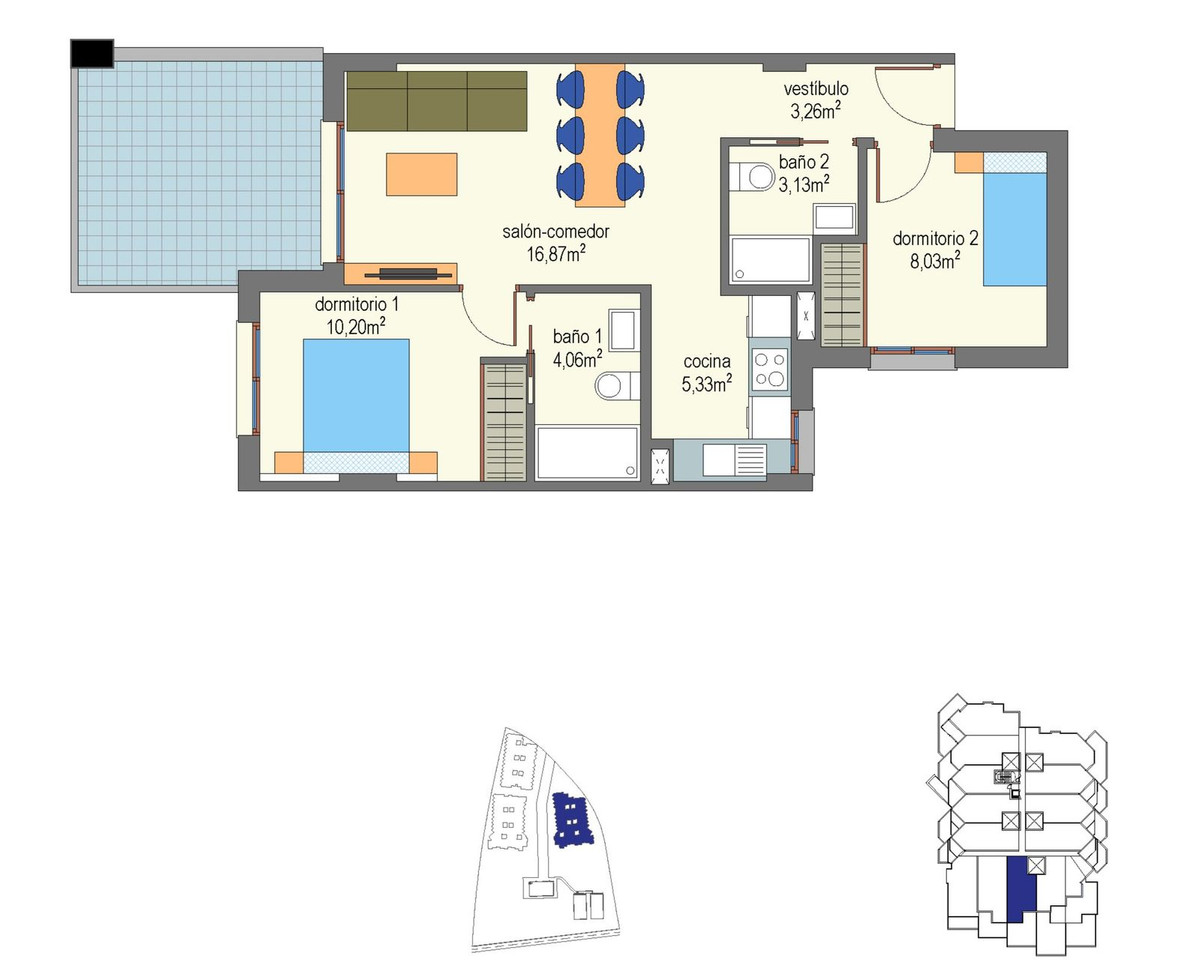 La propriété comprend 2 chambres et 2 salles de bains, agencées dans un espace moderne et fonctionnel baigné de lumière naturelle.