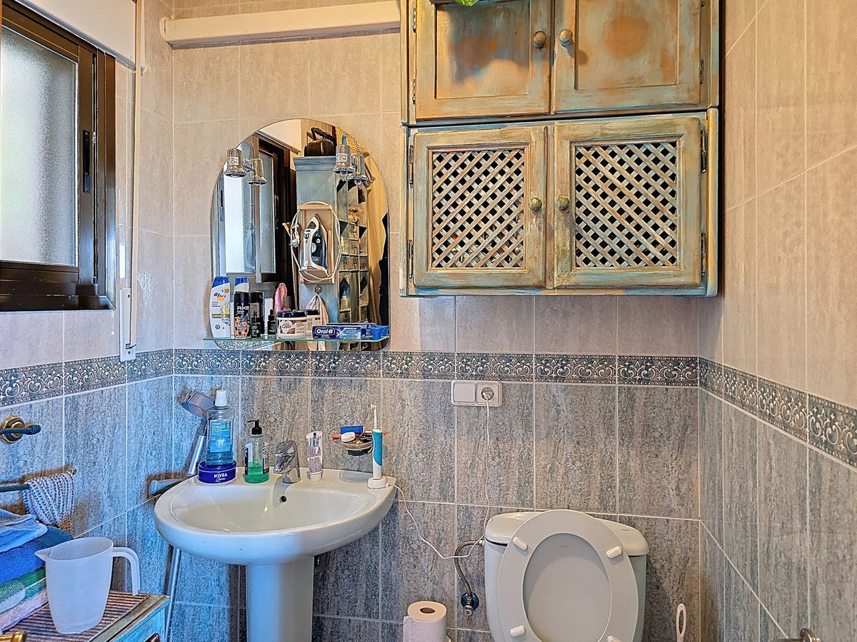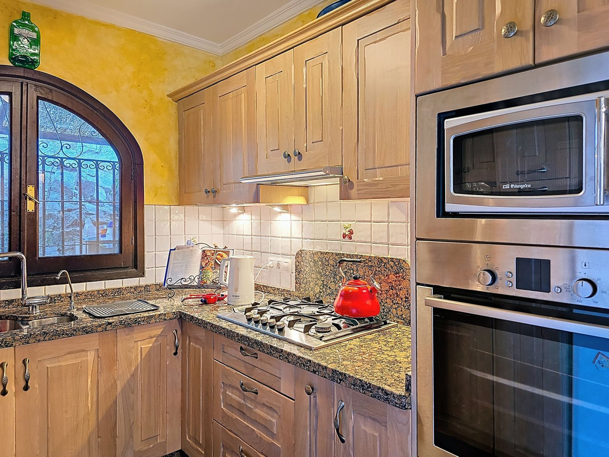 La propriété se compose de deux villas individuelles, chacune avec son propre caractère et son charme. La villa principale présente des éléments rustiques tels que des poutres apparentes et de grandes fenêtres qui inondent de lumière naturelle le spacieux séjour. À l'étage, on trouve une salle à manger ouverte sur une cuisine bien équipée et deux chambres confortables, chacune avec sa propre salle de bains. L'une des chambres donne directement sur le jardin, et une terrasse couverte, accessible depuis la salle à manger, offre une vue imprenable sur la piscine et la verdure environnante.