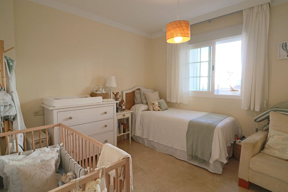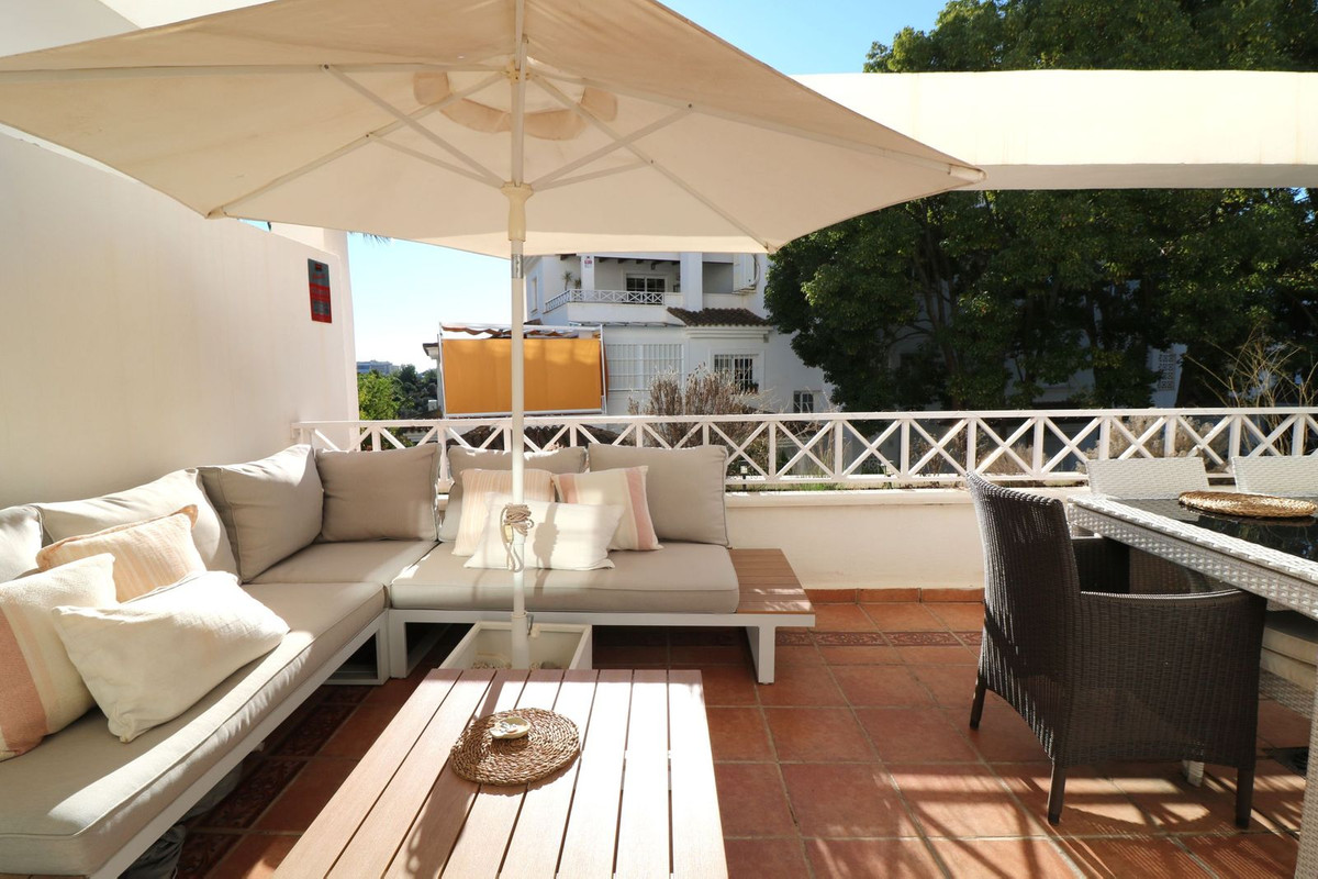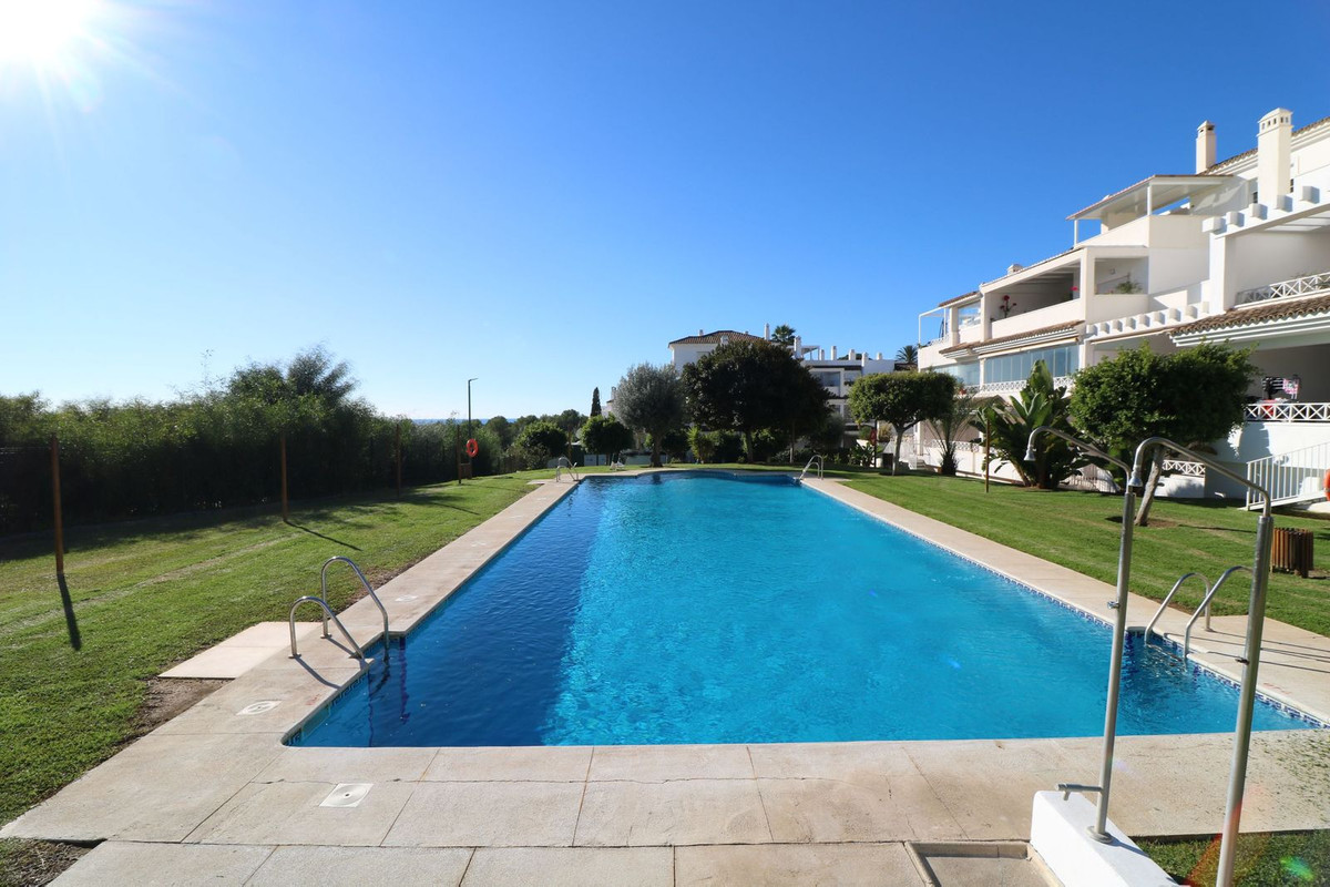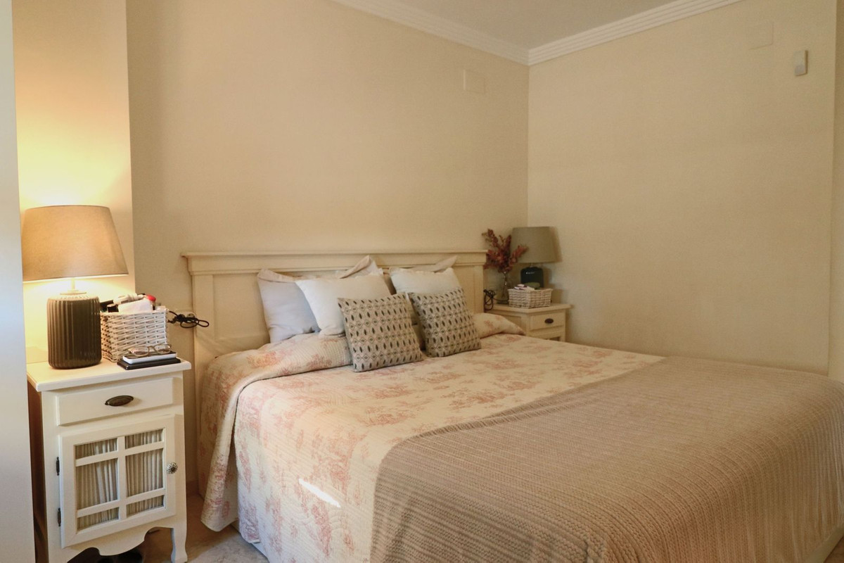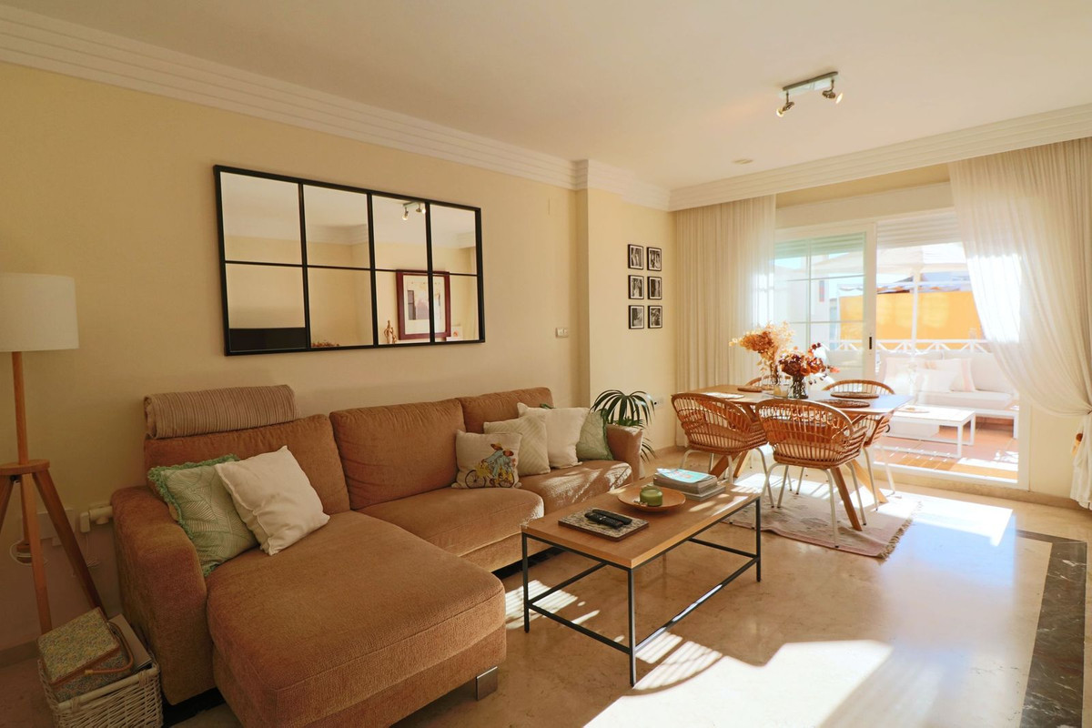 Magnificent southeast-facing two-bedroom apartment in Marbella, located in an exclusive private residential complex offering two swimming pools and spacious communal gardens, just a few steps from the beach and the Río Real golf course. This property, located on an elevated first floor, stands out for its spacious terrace with pleasant views of the green areas. Inside, it is distributed in an entrance hall, a spacious living-dining room with direct access to the partially covered terrace, a large separate kitchen with access to a generous laundry terrace, two bedrooms—the master bedroom being particularly spacious and bright thanks to a large window—and a bathroom. It also includes a large storage room and a parking space.