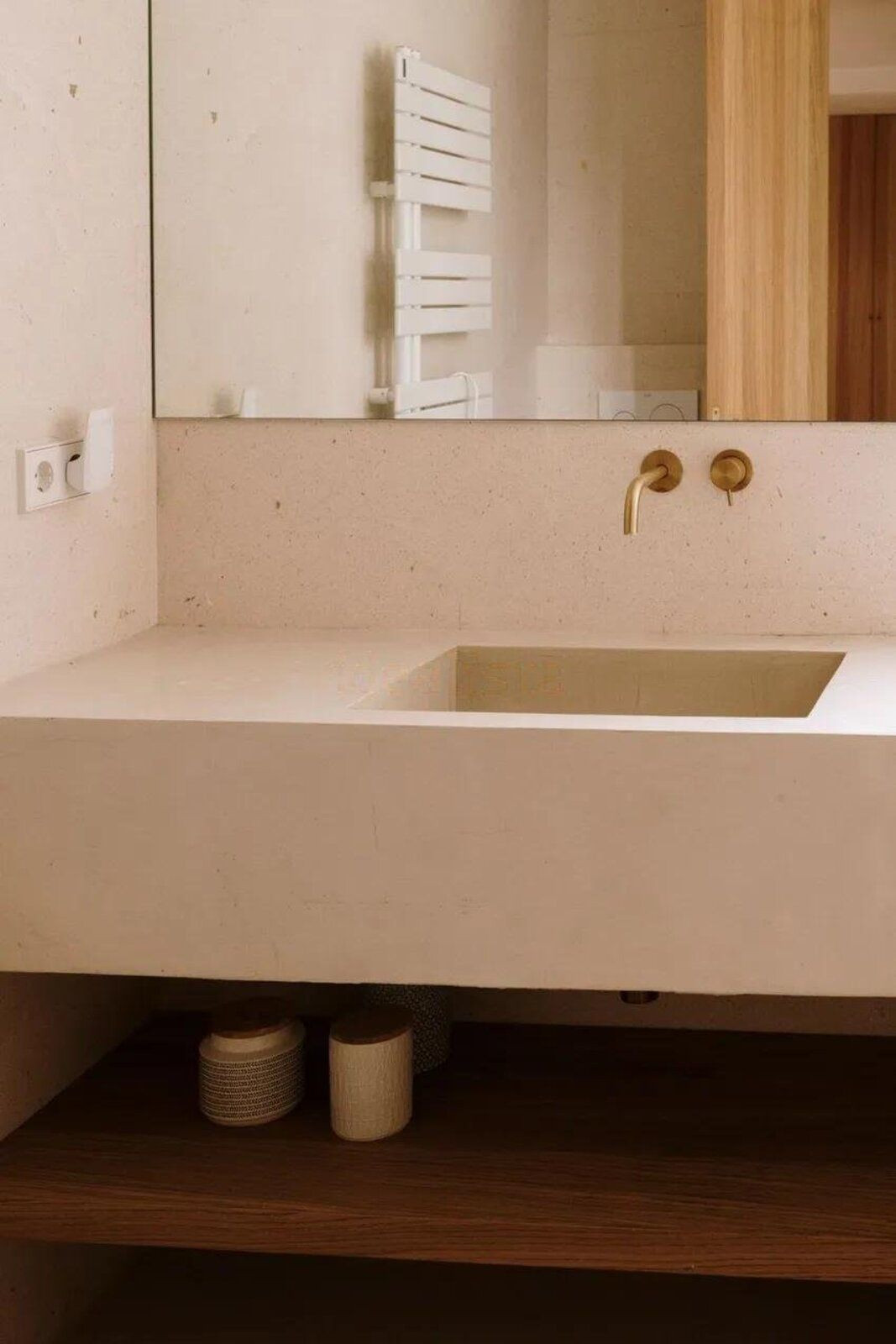 Terrasse d'entrée avec revêtement en microciment, espace de vie ensoleillé toute la journée, jardinières et douche extérieure avec eau chaude et froide.
