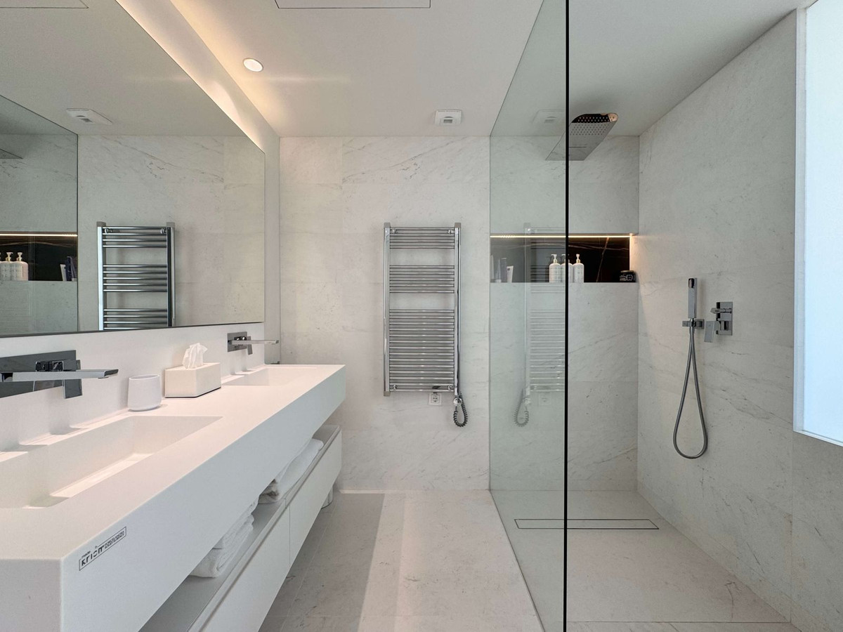 Ce spacieux appartement de trois chambres et deux salles de bains est décoré avec goût dans un style contemporain chaleureux. De grandes fenêtres laissent entrer la lumière naturelle dans les pièces à vivre et créent une transition harmonieuse avec la grande terrasse offrant une vue imprenable sur la mer.
