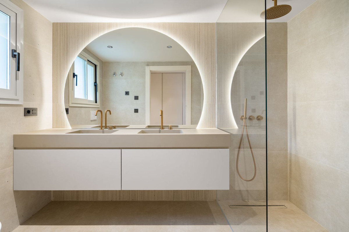 Les trois chambres sont dotées de placards intégrés conçus sur mesure, et chaque salle de bains a été aménagée avec un goût exquis, utilisant des carreaux de porcelaine de haute qualité, des robinets de conception italienne et des détails d'éclairage intégrés qui mettent en valeur l'architecture intérieure.