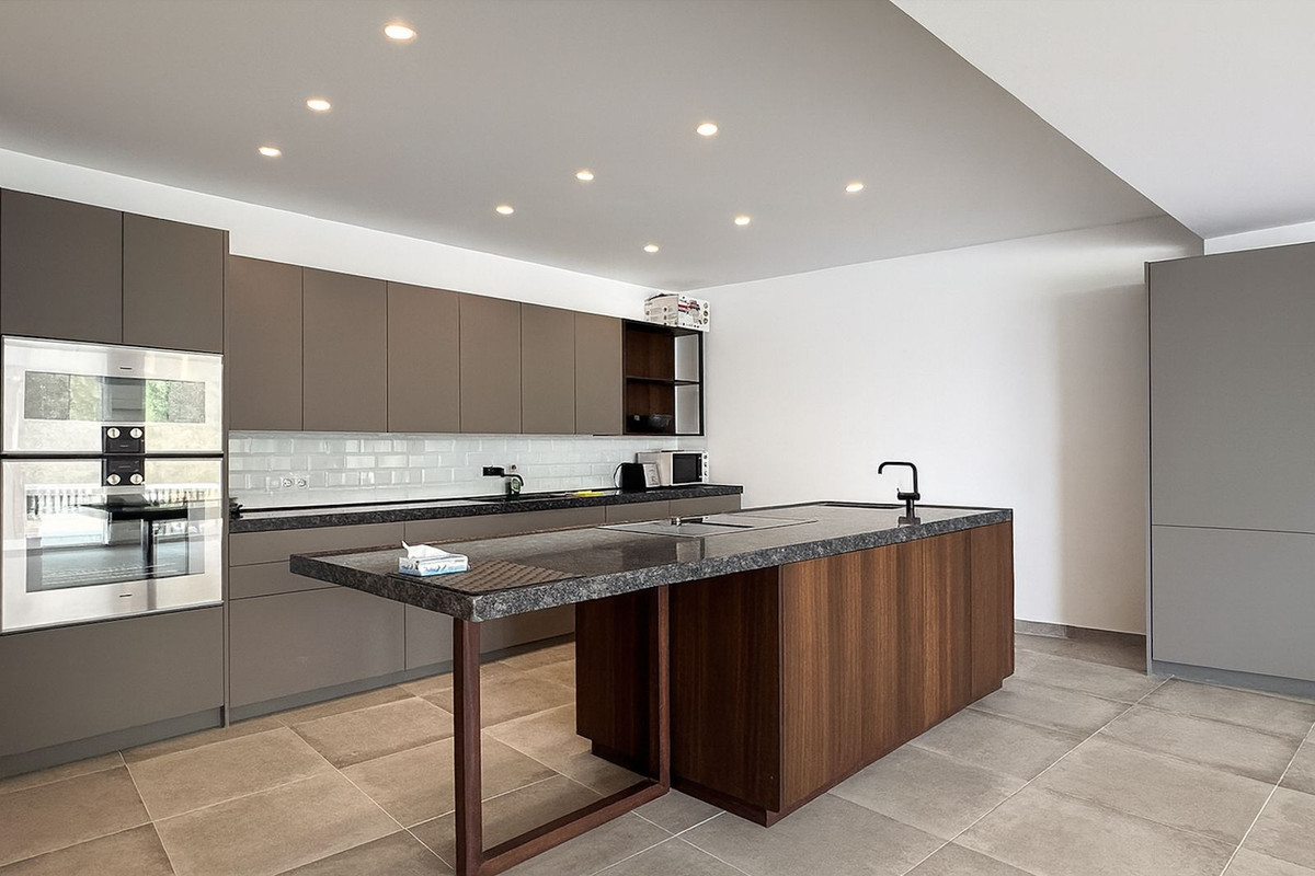Au même étage se trouve une cuisine moderne ouverte sur une buanderie, ce qui optimise la circulation et facilite l'accès. À l'étage inférieur, quatre chambres lumineuses et spacieuses disposent chacune d'une salle de bains privative et de placards intégrés.