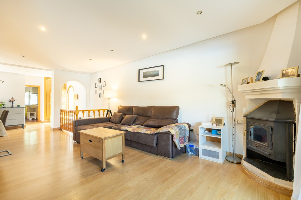 Rez-de-chaussée : Accès par un escalier de 12 marches, hall d’entrée avec placard intégré, spacieux séjour-salle à manger avec placard de rangement et cheminée, accès à une grande terrasse exposée sud-ouest avec table à manger et barbecue donnant sur la piscine et le jardin commun.