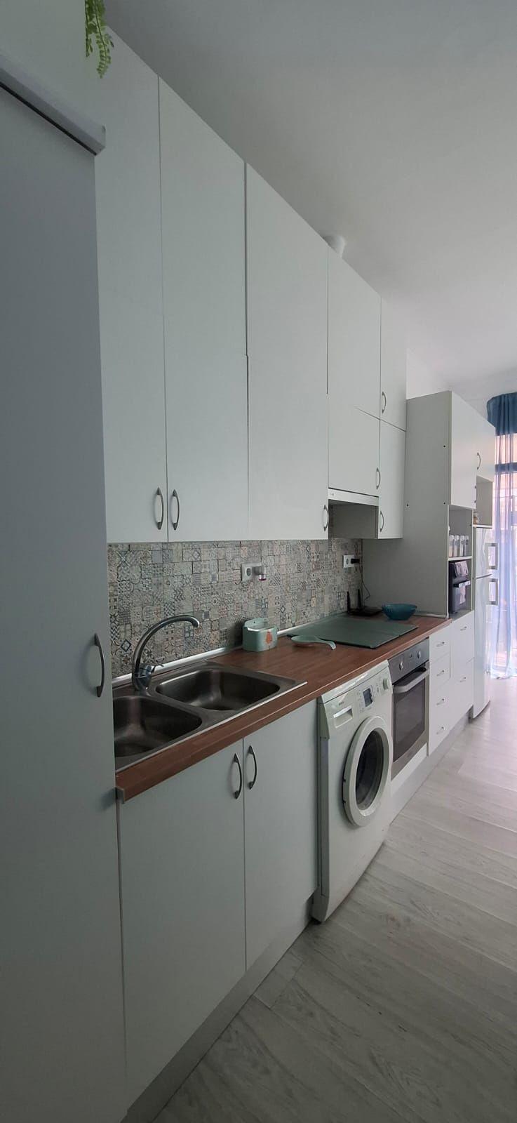 Cuisine entièrement équipée avec appareils intégrés et design pratique.
