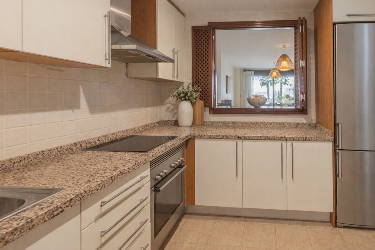 Ce bien se distingue par son agencement optimal et ses finitions de qualité, avec un sol en marbre, un séjour spacieux et lumineux donnant directement sur la terrasse, d'où l'on peut admirer la vue sur la mer et les espaces communs de la résidence. Il comprend deux chambres et deux salles de bains, dont une attenante. La cuisine est fonctionnelle et dispose d'une buanderie séparée. Parmi les autres atouts, citons les fenêtres à double vitrage Climalit, la climatisation réversible par pompe à chaleur et la production d'eau chaude sanitaire par un chauffe-eau électrique.