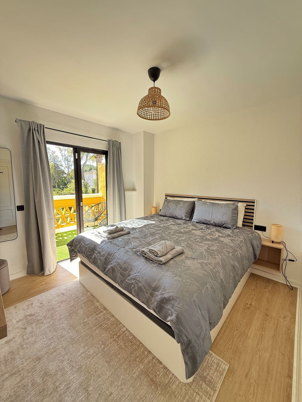 Elle comprend deux chambres extérieures avec placards intégrés, la chambre principale bénéficiant d'une salle de bains privative et d'un accès direct à une terrasse privée. La maison dispose également de deux salles de bains complètes et de toilettes pour invités.
