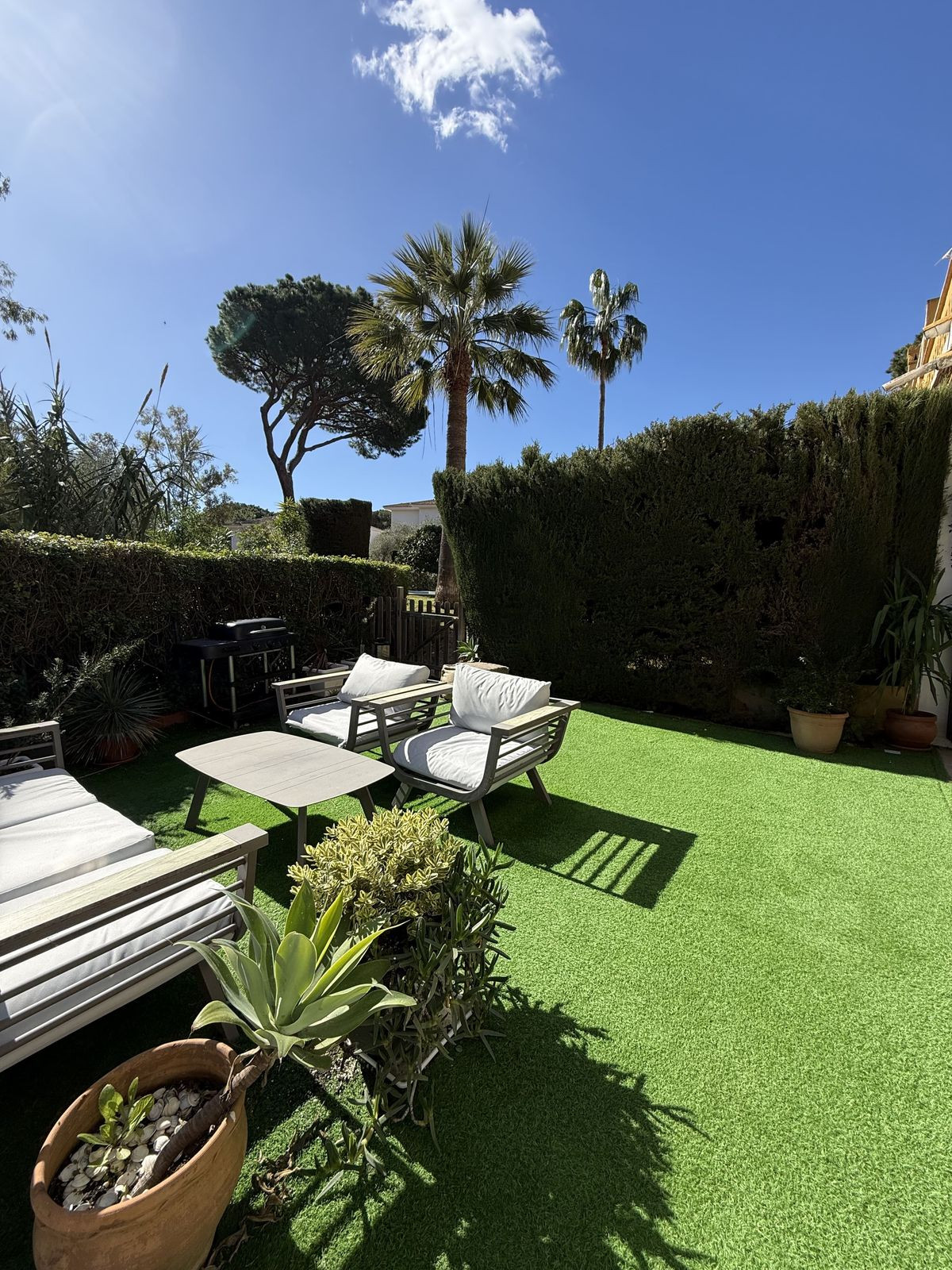 L'espace extérieur comprend une véranda couverte avec cheminée, idéale pour en profiter toute l'année. Le jardin donne un accès direct à la piscine commune. De plus, le côté de la propriété offre un espace privé qui peut être aménagé selon vos besoins.