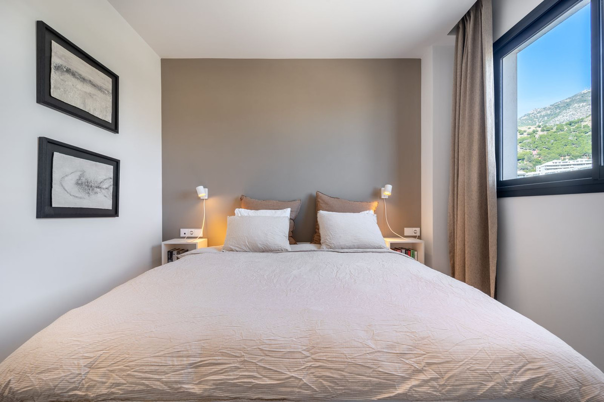 À l'intérieur, l'appartement est épuré et fonctionnel. Le séjour est structuré par des baies vitrées coulissantes du sol au plafond qui estompent la frontière entre intérieur et extérieur. Bénéficiant de finitions haut de gamme, à la hauteur du standing qui a fait d'Higuerón West le quartier le plus prisé, l'espace de vie ouvert offre une fluidité à la fois sophistiquée et naturelle.