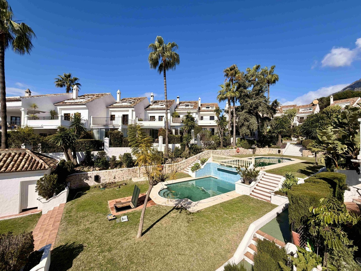 Maison de ville exclusive dans une résidence sécurisée de style andalou avec deux piscines, des jardins luxuriants et arborés et un emplacement exceptionnel à Nagueles, au-dessus du Golden Mile de Marbella.