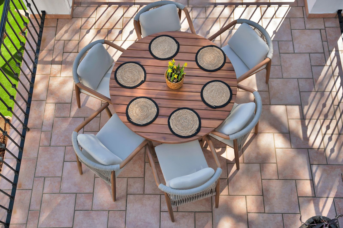 Le rez-de-chaussée est conçu pour la vie quotidienne et les réceptions. La cuisine ouverte, la salle à manger et le salon forment un espace généreux qui se prolonge sur la terrasse. L'ensemble crée une grande et accueillante pièce à vivre, idéale pour les repas de famille, les réunions estivales ou les soirées entre amis.